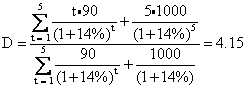 回收期长短取决于债券偿还期、票面利率、偿付性条款、市场收益率等因素。零息债券是一次性支付的证券,即Ct=0,其回收期等于偿还期。若某5年期债券年息为9%,一年付息一次,面值为1000,到期收益率为14%,则期间: