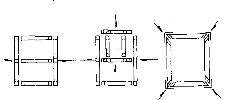 木框装配示意图 1.单向加压的木框; 2.双向加压的木框;3.多向加压的木框 总装配 由于制品的接合方法不同,总装配的过程和顺序也不同。以衣柜为例,大致可分为:❶组成制品的骨架; ❷安装加固,稳定骨架的零、部件(背板、隔板等); ❸安装活动的零、部件(柜门、抽屉等); ❹安装制品的配件(拉手、插销等)。木制品装配过程中,往往还需进行大量的修整、铲平、校正、局部砂光,揩擦挤出的胶液等辅助操作。如果木制品的结构及其加工工艺过程是合理的,加工的零、部件也有足够的精度,就有可能省去这些辅助操作过程。木制品总装配和部件装配一样,也需将被装配的零部件压紧,以达到尺寸准确和接合紧密。在大量生产的情况下,为实现机械化装配应当有通用性的装配机。装配机的台架上装有可调节的横梁、气缸、挡块和安装制品的定位器,可根据制品的外围尺寸和受压部位进行适当的调整。 |
