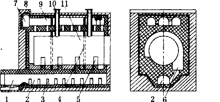 图1 车辆式干馏釜炉体结构1.燃烧炉;2.釜下纵向烟道;3.侧烟孔;4.隔墙; 5.支座;6.环形烟道;7.横向烟道;8.插板;9.釜上 纵向烟道;10.气体蒸汽出口管; 11.干馏釜 形式通过上部出口进入旋风分离器和塔板式焦油分离器,初步分离木焦油。焦油分离器有3~4层塔板,使蒸汽气体中的木焦油冷凝分离,下部有蛇管,通入蒸汽或冷水,以调节温度,使保持102~120℃左右。蒸汽气体再送入列管冷凝器和洗涤器冷凝回收木醋液。木煤气洗涤塔后装设排风机,以降低系统压力,并将木煤气送入干馏炉内燃烧,以节约燃料。与干馏釜门相对的位置上有木炭冷却器,装有轨道与干馏釜连通,干馏完毕时,将盛木炭的料车趁热转入木炭冷却器,密闭后用冷水从外部喷淋进行冷却,并立即将新料车装入干馏釜内进行下一次干馏,以缩短生产周期,节约燃料。每次操作周期约24小时。 内热立式干馏釜 利用木材干馏本身产生的木煤气燃烧得到的热烟气作为载热体,送入干馏釜内部加热木材,在开工初期或木煤气量不足时,可燃烧煤气或重油。工艺流程见图2。