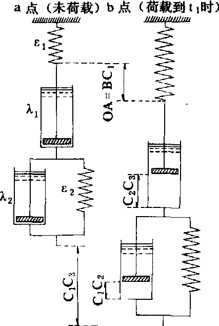 表示串联和并联的弹性及 现在考虑弹性与粘性单元串联和并联交替配置的恒应力一流动曲线,理想的弹性体在恒应力(σ)下的变形(ε)不随时间而变化,根据虎克定律ε=σ/E代表弹性模量,可推导出流动曲线E=f(t)=常数: