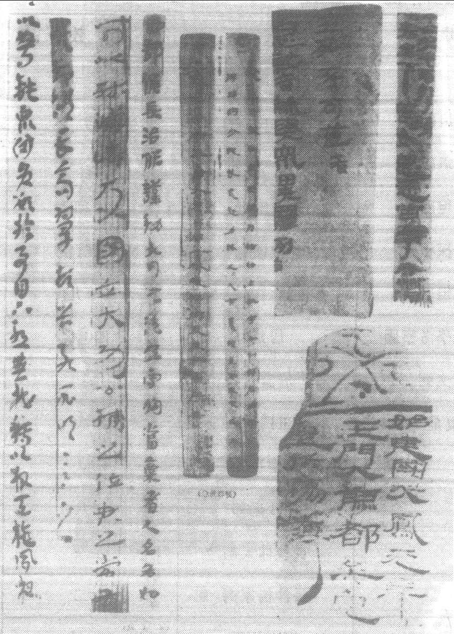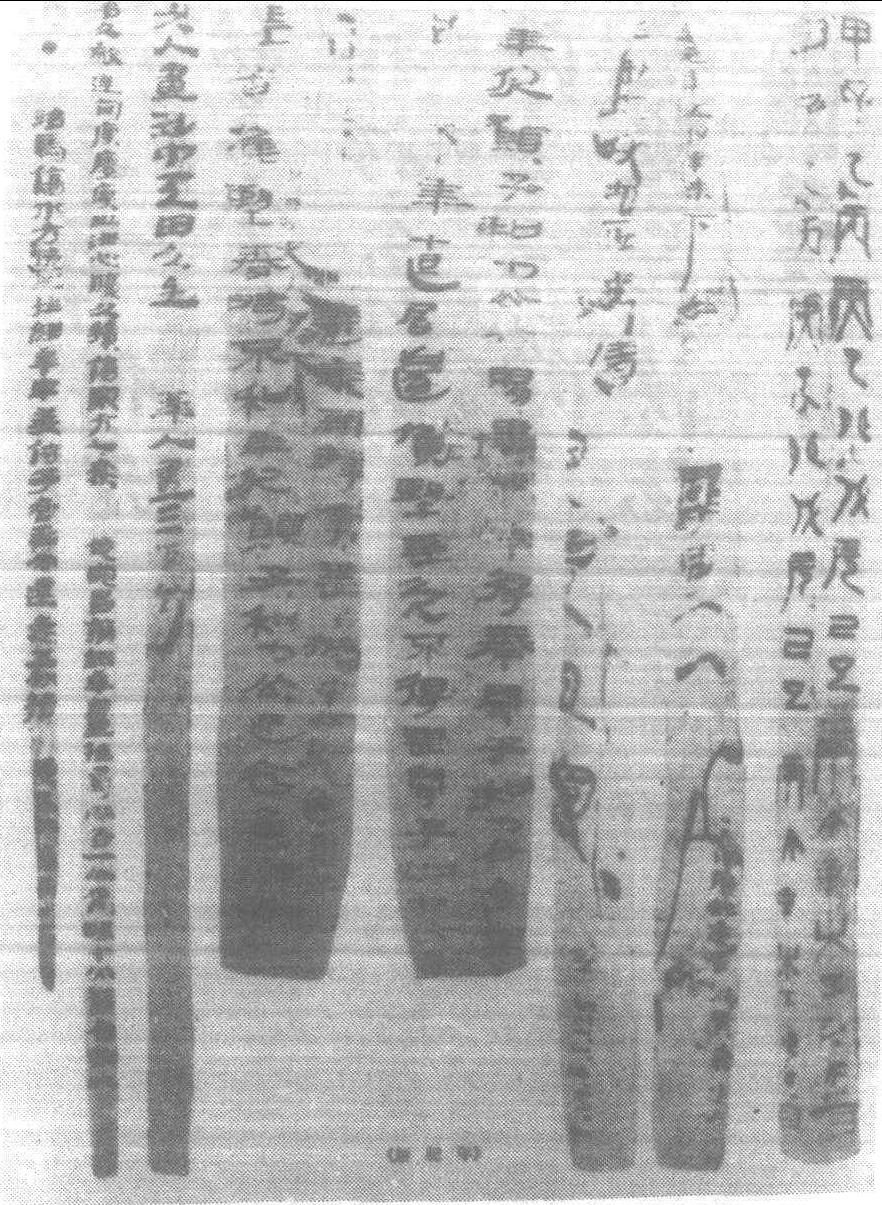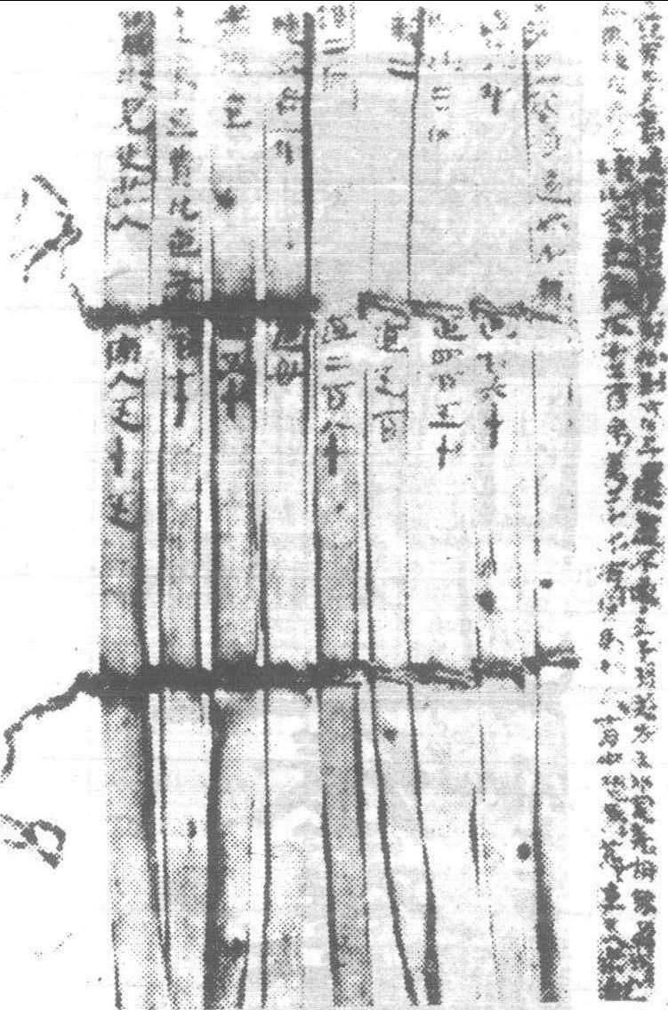 木簡 并竊走晉代木簡一百二十一片,此蓋木簡發見之嚆矢。1900年至1901年,馬克·奥里爾·斯坦因 (1862—1943英國考古學者,原籍匈牙利)受英國印度殖民政府顧聘,非法入華西部,探測古于闐(古西域國名,又作于寘在今新疆和田一帶) 之遺迹,於和闐(和田縣)、克里雅、尼亞等地,訪得并盗走晉代簡牘累累。1907年斯坦因又深入甘肅西部,考察古長城遺迹,盗劫兩漢及晉代木簡數百片。日本西本願寺探險隊三度赴中國西部考察,第二次(1908—1909)搜集大量木簡,舶載日本。此係初期木簡發掘物。1930年以後,陸續出土甚豐,多達數萬計。其大略參見附表: 〈木簡之形態〉 普通木簡長23公分,寬1公分,厚0.2至0. 3公分。竹簡之字書於裏面,而木簡兩面寫。一方簡約書三十至四十字,若連寫兩簡以上,則將簡以紐相繫。紐多為麻繩,上等紐用素絲綸或青絲綸,偶用革條。常縛成兩道,故有象形字“册”。簡書多以甲骨文或金文,殊顯古雅。“典” 字意即置册于臺上。 所書木簡之文,若屬保密尺牘或紀要文書,則卷成一捆,其上置蓋 (稱為 “檢”),以繩縛實,繩上涂泥,鈐押封印,此即 “封泥”。繩繫結頭大都埋藏於里處,以使木簡在移動或送遞過程中,封泥不致破損。 “觚”亦為木簡之一種。一般木簡不過表裏里兩面書,若製成三角柱、四角柱或六角柱,則可三面、四面、六面書,此即所謂 “觚”。 〈木簡之内容〉 名目繁多,有法律、書籍、遺策、文書、詔書、通行證、發貨證、帳簿等。 (1)法律——秦漢時木簡出土略表之法文,除少數尚載於史籍、文獻外,大都已散佚。而“雲夢秦簡”中,與秦律相關者達六百枚,洵為秦律研究之必需。 (2)書籍—— “武威漢簡”中,書寫《儀禮》者有四百六十九枚,計二萬七千三百三十二字。“臨沂漢簡” 中有書 《孫子》、《六韜》、《管子》、《墨子》 等。“長沙漢簡” 中良多醫學書。 (3) 遺策——埋入墳墓之殉葬品目録。楚簡多此類。 (4) 文書——多與軍務暨邊境行政相關,見於 “江陵漢簡”等。 (5)詔書——見於“敦煌漢簡”及“居延漢簡”。 (6)帳簿——見於 “居延漢簡” 及 “敦煌漢簡”,為官廳暨軍事帳簿。其它尚有通行證、發貨證、符節等。