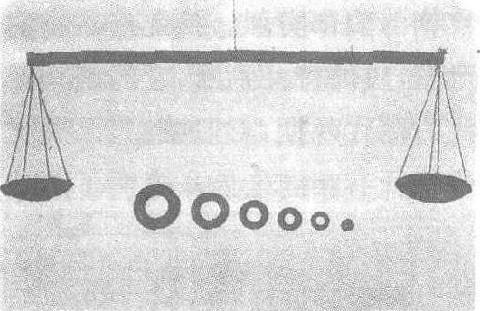 战国·楚。权,即称锤。木衡杆长41.1厘米,铜盘直径7.3厘米。环权的重量,外径长度如下:
