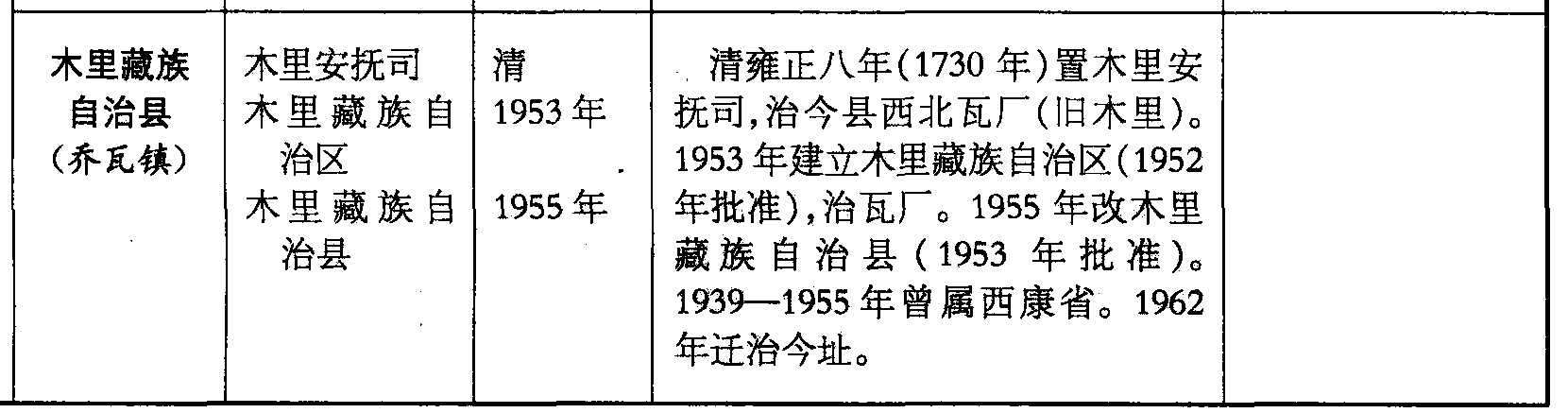 木里藏族自治县(乔瓦镇)木里安抚司木里藏族自治区木里藏族自治县清1953年1955年清雍正八年(1730年)置木里安抚司,治今县西北瓦厂(旧木里)。1953年建立木里藏族自治区(1952年批准),治瓦厂。1955年改木里藏族自治县(1953年批准)。1939—1955年曾属西康省。1962年迁治今址。