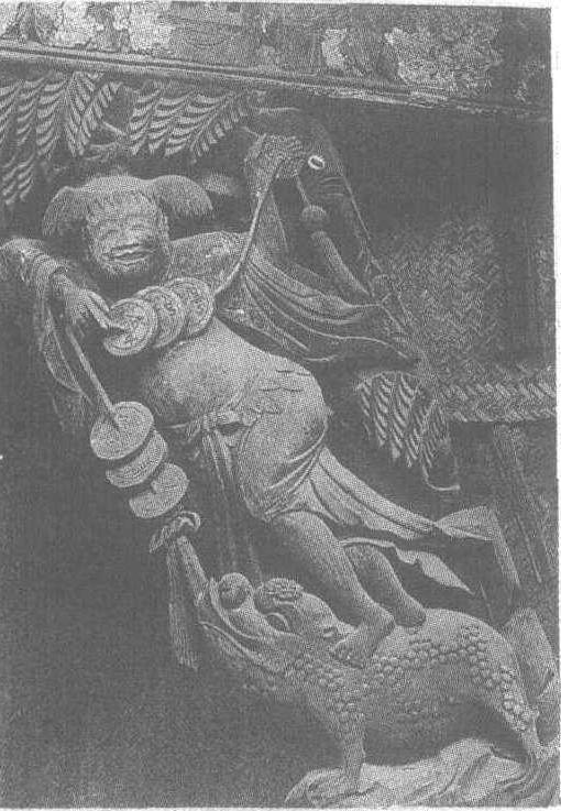 | 释义 | 木雕刘海戏金蟾 木雕刘海戏金蟾清。为浙江省衢州市柯城区宁绍巷九号建筑檐柱附件。高95厘米。刘海脚踩金蟾,蓬发如犬齿,披肩高扬,袒露着系长带的鼓腹,双手提拉一绳,上穿七枚铜钱,眉开颜笑地舞着,以之戏逗足下金蟾。金蟾张口衔住绳下端璎珞,眯眼卷鼻,一副兴高彩烈样。此雕刻生动活泼,使人见而发笑,颇具感染力。刘海戏金蟾典出于道教,由传说的辟谷轻身的人物附会而成,寓以财源兴旺,幸福美好。