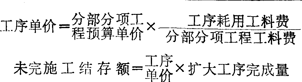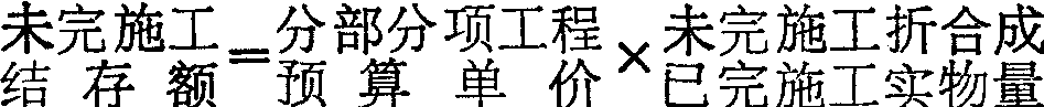 (2)估量法:根据现场的实际施工情况,将各个分部分项工程已投入的人工、材料的未完施工部分,估计折算成相当于已完施工实物量,然后再乘以分部分项工程的预算单价。计算公式为: