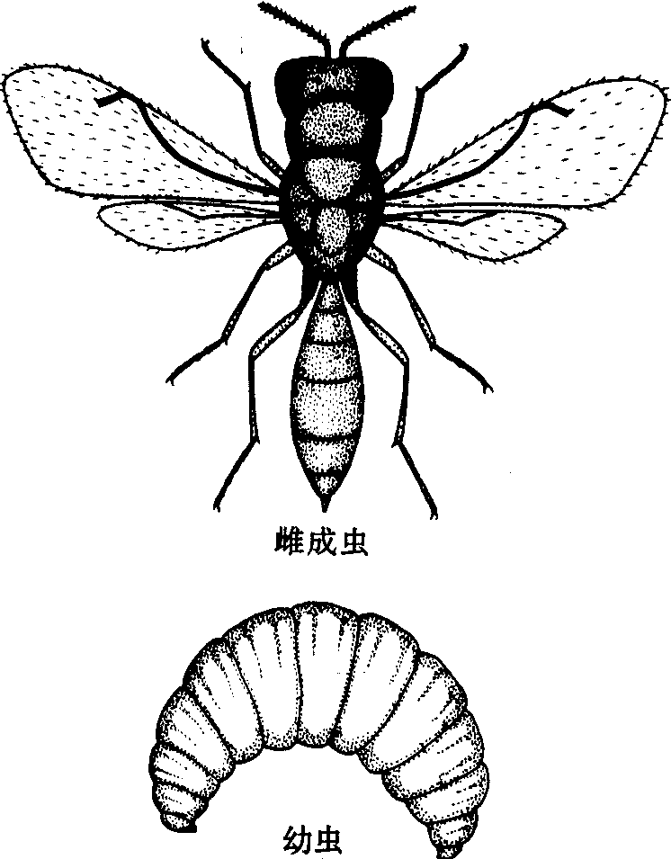 | 释义 | 杏仁蜂apricot seed wasp杏树果实害虫。学名Eurytoma samsonovi wass。膜翅目,广肩小蜂科。分布于中国新疆、辽宁、河北、河南、山西和陕西。为害杏和扁桃。雌成虫长5~7毫米,翅展10毫米左右。头和胸黑色,密布刻点,复眼暗红色。触角9节,膝状,柄、梗节橙黄色,鞭节黑色、较粗、生短毛。各足基节黑色,转节以下和腹部橙黄至橘红色。腹部末端尖。产卵器深棕色,平时纳入纵裂的腹鞘内。雄略小,触角鞭节念珠状,环生长毛。腹部黑圆形,各节短小。各足腿节或胫节有时杂有黑色。卵圆筒形,微弯,初产乳白后变淡黄色。末龄幼虫长7~12毫米,纺锤形,略弯。头淡褐色,上颚发达,端部黑褐色。胸腹部13节,淡黄白色。裸蛹长6~8毫米(见图)。年生1代,以末龄幼虫于被害果核内越夏越冬。新疆库尔勒3月中旬至4月中旬化蛹。蛹期约30天。杏花谢落时开始羽化,经一段时间成虫方咬一圆羽化孔脱出,飞往树上交配产卵。白天活动,中午前后最盛。杏果指头大时硬核前太量产卵,产卵器刺入果内将卵产于种皮下。每果产卵1粒。向阳面果实落卵多。每雌产卵约120粒。雌雄比为5:1。成虫寿命一般7~8天。卵期30余天。杏果膨大子叶形成时孵化,幼虫蛀食杏仁,蜕皮4次,杏仁食尽即达末龄。落地果比树上果中的成虫羽化早,死亡率也低,雄虫羽化比雌虫早。宜在羽化前清除落果和树上僵果;加工杏仁时水选淘出虫核,集中处理;羽化盛期可喷洒敌百虫等药剂毒杀成虫。