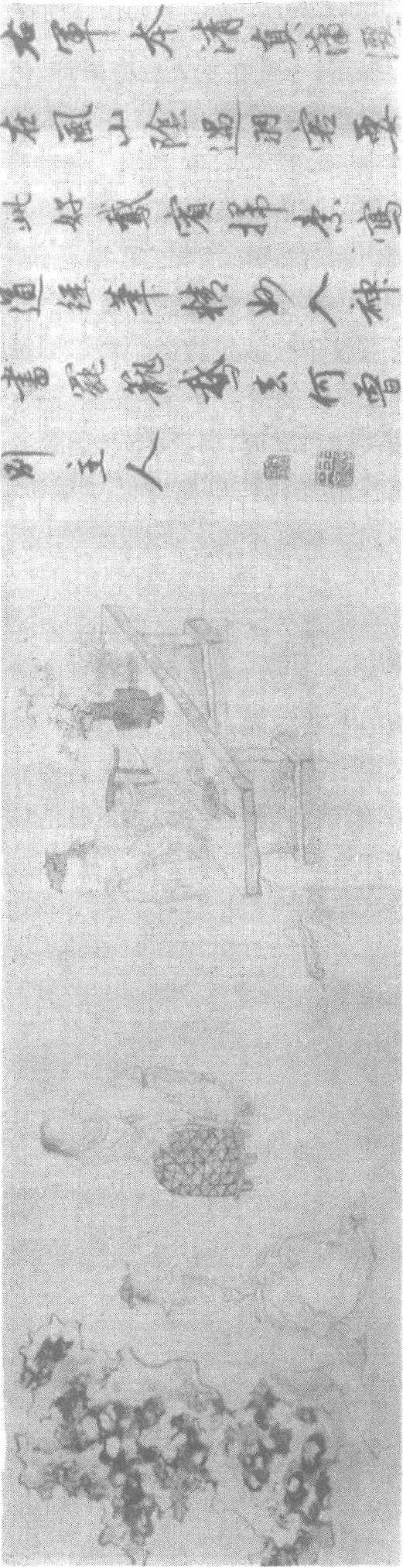 | 释义 | 杜堇古贤诗意图卷 杜堇古贤诗意图卷明。杜堇(见《杜堇玩古图轴》条目)绘。纸本墨笔。纵28厘米,横108.2厘米。北京故宫博物院藏。此图共分九段,每段有明中叶金陵人金琮书写的唐宋名诗,杜堇根据诗意而作图。这九段依次分别为唐代李白的《右军笼鹅》、韩愈的《桃源图》、李白的《把酒问月》、韩愈的《听颍师弹琴》、卢同的《咏茶》、杜甫的《饮中八仙歌》、杜甫的《东山宴饮》、宋代黄庭坚的《咏水仙》及杜甫的《舟中夜雪》。图亦九幅,每幅皆用笔秀逸挺劲,人物刻画得生动传神,墨色淡雅,诗情与画意相映生辉,各段图简述如下:《右军笼鹅》图中,王右军(即东晋大书法家王羲之)依石案侧身而坐,左手执卷,卷展铺于膝上,右手挥笔,毫向内,一副运思的洒脱神情。对面是一道士,谦恭地坐着,其神情表达出不惜以群鹅换取一卷道经的微妙心态。旁边一童稚俯身提笼。图的背景比较简洁,有一块湖石,石案上有一花瓶和笔、墨、纸、砚。画中意境清幽。《桃源图》画一高士,风度翩翩,立观桃源图轴,旁侧有童子侍候。《把酒问月》画一老翁,正襟危坐于桌前,桌上摆放着酒樽、菜肴和书卷,老翁凝神静气,眺望远方空中枝梢圆月,后边一女仆双手抱着酒壶侍奉。此图深得诗句“唯愿当歌对酒时,月老常照金樽里”旨意。《听颍师弹琴》写一琴师席地弹琴,奏罢欲携琴而起,一听者卧地面对琴师,听得痴醉神迷,回味无尽,另一过路者也驻足倾听。此图与韩愈的诗句相配情景交融。《咏茶》画一将军在院子的围墙外敲门,室内的一老翁卧床酣睡,被惊醒。此图是依诗中“日高丈五睡正浓,将军扣门警周公”之句而绘。《饮中八仙》画的是贺知章、李璡、李适之、崔宗之、苏晋、李白、张旭、焦遂八人聚在一起饮酒,醉后的各种形态栩栩如生。《东山宴饮》原题是《陪王侍御同登东山最高顶宴姚道泉晚携酒泛江》,图中三人围坐于矮石桌边饮宴,其中一边的杜甫回首侧身向童侍,童侍双手执酒壶,正欲上前斟酒。杜甫对坐的另二人正举杯畅饮。背景中苍松葱郁,岩石峭拔,左侧山崖边停靠一叶扁舟,以示傍晚携酒泛江。《咏水仙》原题是《王充道送水仙花五十枝欣然会心为之作咏》,画中一老翁在藤蔓挂枝的树下,席地坐于水畔边低矮的石几旁,左肘伏几,右手按瓶,若有所思地欣赏着皓月倒影和水边的簇簇水仙,很富有诗情画意。《舟中雪夜》原题是《舟中雪夜有怀卢十四侍御弟》,包括三首五言律诗。图中,在一棵岩石边的大树下,有一叶孤舟静泊于此。舟中一老翁即诗人杜甫,神色寡欢忧郁,整幅画面凄凉萧条。诗中写道“北雪犯长沙,胡云冷万家”,大概是诗人在躲避“安史之乱”时所作,诗情与画意相通。卷末题款:“索仆书古诗十二首将往要杜柽居为图其事。柽居无讶仆书敢占其左,以渍痕在耳,他日图成,必有谓珠玉在侧觉我形秽者,仆奚辞焉。弘治庚申六月廿八日金琮记事。”钤<金元玉氏>、<云间漫叟>二印。各幅书画,另有印章。此图卷在金琮书后不久即画毕。