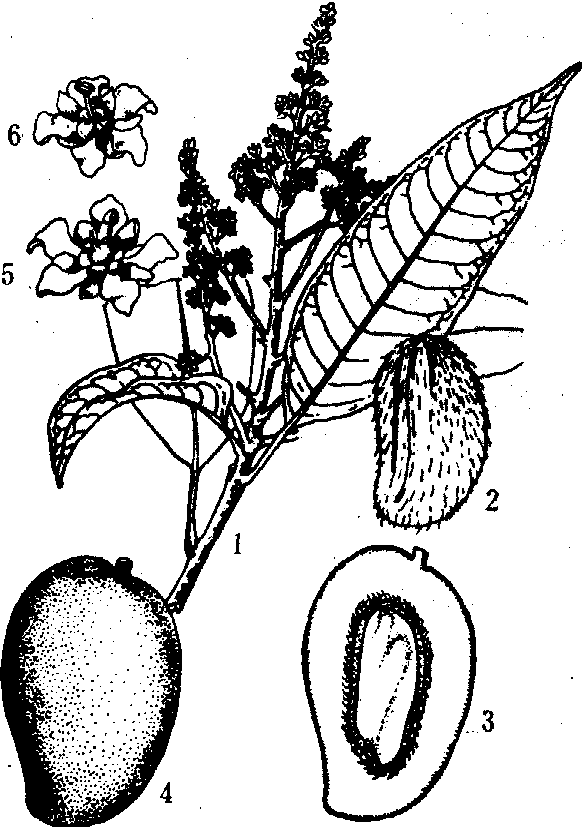 杧果 杧果漆树科杧果属常绿乔木。又称芒果、檬果。原产印度、马来西亚。中国唐代引入栽培,已有1000多年栽培历史。全属60余种,其中15种果实可供食用。中国有2种。树高约10~20 m,叶长10~20 cm,顶生圆锥花序,花小而多,杂性同株。花瓣4~5,浅黄色。果长卵形偏扁,长8~15 cm。花期2~4月,果熟期5~9月。可耐43℃高温,不耐寒,5℃时枝叶即受冻害,气温0℃左右幼苗即冻死。生长适宜温度15~35℃。果核扁平,有纤维与果肉相连。果实营养价值高,含有丰富的维生素A、B、C。含糖11%~12%,鲜食,还可作蜜饯、干果、果醋。树姿优美,可作观赏树、行道树。栽培品种1000多个。嫁接苗4~5年结果。1~3月开花,4~9月陆续都有果实成熟。 杧果 杧果Mangguo漆树科。热带著名果树。常绿大乔木。单叶,互生,革质,披针形。圆锥花序,花小,黄色或带红色。核果椭圆形或卵形,微扁,长5—10厘米,熟时黄色,果核(内果皮)木质,并覆被粗纤维。原产喜马拉雅山以南。我国台湾、海南、福建、广东、广西、云南有栽培。果味鲜美,可生食或干制;果核和果皮可入药;叶和树皮为黄色染料;树皮含胶质树脂,木材暗褐色,坚重、致密、韧性强、耐海水浸渍,易加工,可制舟车、器具、细木工等。