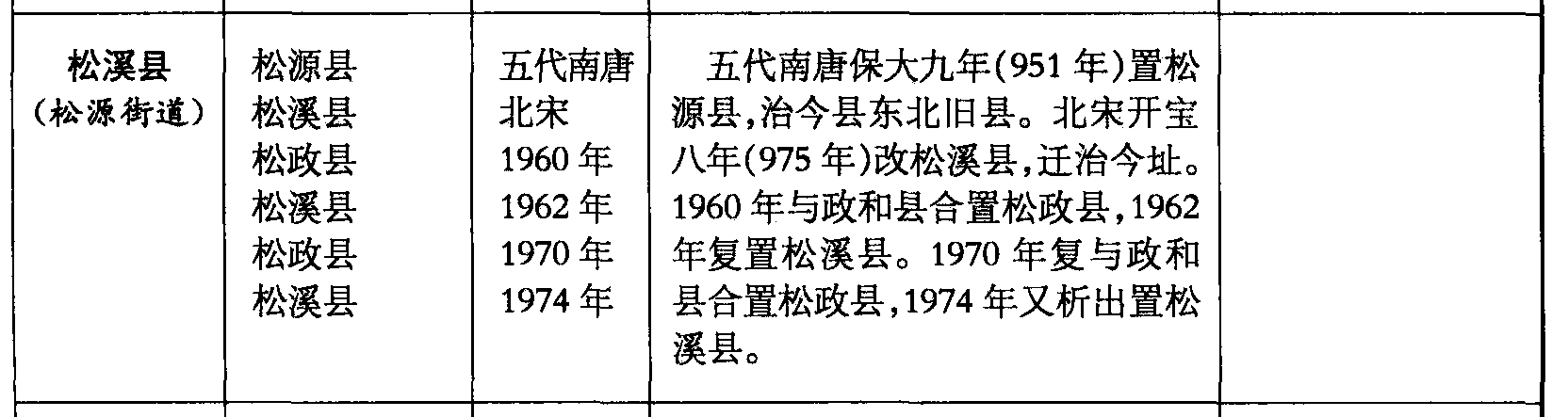 松溪县(松源街道)松源县松溪县松政县松溪县松政县松溪县五代南唐北宋1960年1962年1970年1974年五代南唐保大九年(951年)置松源县,治今县东北旧县。北宋开宝八年(975年)改松溪县,迁治今址。1960年与政和县合置松政县,1962年复置松溪县。1970年复与政和县合置松政县,1974年又析出置松溪县。