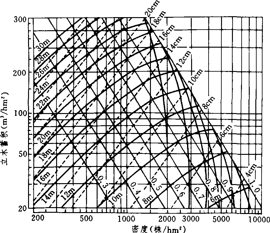 | 释义 | 林分密度管理图stand density control charts一种表达林分生长与密度之间数量相关的曲线图。它由等直径线(标有cm的虚线)、等树高线(标有m的实线)、等疏密度线(标有0.3至0.9的接近于对角线的实线)、最大密度线(标有1.0的接近于对角线的实线)和自然稀疏线(弧形下垂的实线)组成,分别树种绘制,供确定抚育采伐强度用。使用时应先测得计划间伐林分的平均胸径和上层木高,根据图中等直径线和等树高线的交点,可查出相应林分的密度和蓄积量,再与计划间伐林分的密度和实有蓄积量相比较,即可确定出应当采伐的株数和材积数,从而计算出间伐强度。