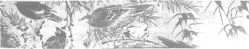 纸本,设色。纵34厘米、横1211.2厘米。现藏北京故宫博物院。描写水沼灌木之间,聚集了许多禽鸟,有飞、鸣、宿、食等多种姿态。用笔遒劲,但法度严谨。在墨之上罩 一层淡彩,这是继承元代花鸟画的传统方法。此种画风在明代院画中独树一帜。有人称之为写意,有人称之为粗笔画。