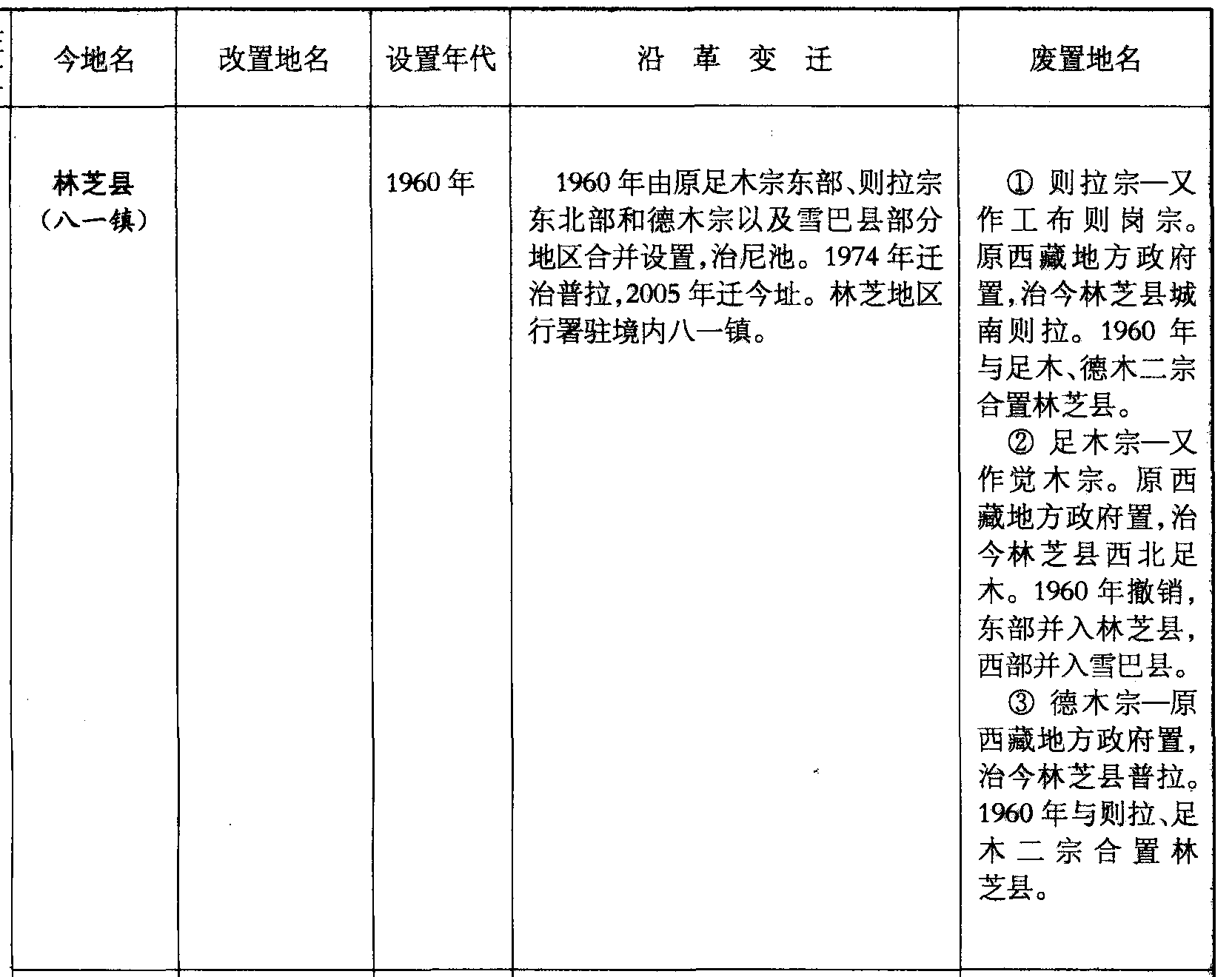 林芝县(八一镇)1960年1960年由原足木宗东部、则拉宗东北部和德木宗以及雪巴县部分地区合并设置,治尼池。1974年迁治普拉,2005年迁今址。林芝地区行署驻境内八一镇。❶ 则拉宗—又作工布则岗宗。原西藏地方政府置,治今林芝县城南则拉。1960年与足木、德木二宗合置林芝县。❷ 足木宗—又作觉木宗。原西藏地方政府置,治今林芝县西北足木。1960年撤销,东部并入林芝县,西部并入雪巴县。❸ 德木宗—原西藏地方政府置,治今林芝县普拉。1960年与则拉、足木二宗合置林芝县。