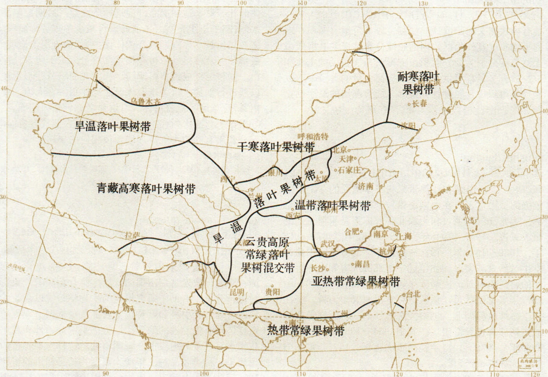 图1 中国果树带图 生长发育与气象 表1 主要果树的适栽温度(年平均温度℃)