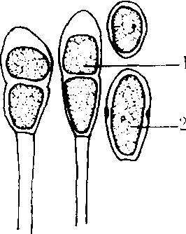 柄锈菌属 1.冬孢子 2. 夏孢子 |