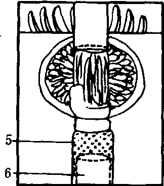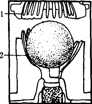 (d) 压榨结束,推出果皮 图1 FMC柑桔榨汁机榨汁过程 1.上爪形钵; 2.下爪形钵; 3.上刀片,将果实上半部分切出一个圆形开口; 4.下刀片,将果实下半部分切出一个圆形开口; 5.粗过滤用的筛管; 6.空心管; 7.果皮向上离开榨汁器; 8.滤出汁液和少许果肉的滤管; 9.果实在此处被空心管挤压;10.果皮和果皮油