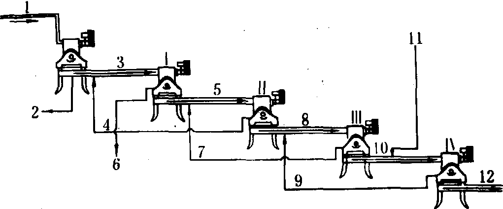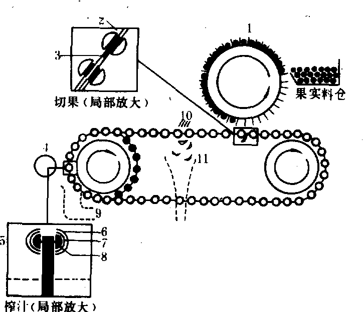 图2 布朗榨汁机工作原理 1.果实输送轮;2.在输送带上固定果实;3.切果刀将果实一剖为二;4.榨汁;5.榨汁(局部放大);6.固定钵;7.果实钵;8.旋转榨汁头;9.汁液流出;10.果皮松动,与输送带分离; 11.推出果皮 粗滤 其目的是将多余的果实成分从汁液中分离出去。常用的FMC柑桔通用粗滤机是一种转速很高、螺杆与分离筛间距很小的螺旋式榨汁机。螺杆不断地将含果肉的汁液输往粗滤机内部。机器终端有一个节流挡料板,果肉至此处形成渣饼,从而产生反压力,迫使原汁从筛孔流出。原汁经粗滤机下部的原汁罐泵入浓缩设备的缓冲罐中。果肉从挡料板开口处排出。原汁罐中有一块垂直挡板,可以隔开开始工作时在工作压力不足的情况下流出的原汁。在正常情况下,从粗滤机获得的原汁的果肉含量、果胶含量和生物类黄酮类化合物含量都很低,可用以制造高浓度浓缩汁。 离心分离 其目的是降低过高的果肉含量和分离原汁中的不理想成分。离心分离也可用做浓缩的预处理作业。它还可以同时排除原汁中比重大于原汁的成分,如小果核以及富集在果肉中的不利成分黄酮类化合物。缺点是导致出汁率下降和增加设备投资。 脱气和油水分离 进入原汁中的空气是造成柑桔异味的主要原因。在柑桔加工过程中必须避免半成品和原汁与空气接触。在榨汁和粗滤过程中,原汁有可能出现氧气饱和现象。所以必须排气。用高真空降膜蒸发器可以除去原汁中的大部分氧气。在现代无菌果汁加工设备中,脱气装置通常安装在加热装置之前。将热原汁喷入真空室中可以去除原汁中的果皮油。这种过去很少采用的工艺可以为小型加工厂生产贫油的甜橙原汁。 果皮油加工 外果皮的细胞层内含有果皮油的油腺。在FMC榨汁机中,果皮油乳状液与外果皮碎块一起由榨汁机进入专用的果皮油初滤机中。乳状液在初滤压力的作用下经筛孔流出,从而滤出绝大部分较为粗大的固体颗粒。乳状液中较小的果皮颗粒和残渣则在自排渣式离心分离机清除,最后再用分离乳水用的离心分离机将乳状液中的果皮油分离出来。为了降低环境污染程度,除油后废水仍然流回设备中循环使用。在布朗榨汁机中,果皮油是在榨汁前获得的。制油时,果实进入平行排列的、整个圆周上布满锯齿形小刀的辊轴上,下部浸没在反向流动的水中。旋转着的小刀切开油腺,果皮油与水形成乳状液流出设备。然后用同样的方法制得果皮油。布朗榨汁机则先榨汁后制油,榨过汁的半个果皮被切开,平整,经锯齿形辊轴输往剥皮刀,切出含有油腺的薄薄的外果皮层,再用挤压辊挤出果皮油,用水乳化果皮油,最后离心分离。在上述第2种英德利卡多榨汁机中,整果前进的同时,其外果皮被两个旋转滚筒搓擦;贝都齐榨汁机则用一组搓擦辊搓擦整果外果皮;搓擦的同时均用水喷淋果实。由果皮油乳状液制取果皮油的过程与上述相同。果皮油的浓缩通常在真空状态下进行。浓缩时,挥发性的碳氢化合物D-帖二烯和浓度可达95%的果皮油主要成分从乳状液中蒸发出来。浓缩果皮油的芳香物质浓度为普通果皮油的2.5~40倍,而且相对不易氧化,不易出现异味,所以还可以在高温下,例如在焙烤食品中使用。 果肉浸提汁的加工 利用四级逆流式柑桔果肉浸提系统(图3)加工,果肉和水要混合4次,再分离4次。每次浸提,果肉的固形物含量都比上一次浸提时高,因而所得的浸提液的固形物含量也比上一次高。饮用水进入第四级混合器,与已经被浸提过数次、固形物含量很低的果肉混合,进行浸提。新鲜果肉进入第一级混合机,与已浸提了三次的液体混合,进行浸提。从第四级混合机中排出的废弃果肉的可溶性固形物的含量为1~2白利度。从第一级混合机中流出的成品浸提液的固形物含量在4~8白利度之间。浸提汁流到蒸发器的预贮罐中后添加100~500毫克/升果胶分解酶进行酶处理,再浓缩到60白利度;添入的果胶分解酶在浓缩时受热钝化。在饮料中添加果肉浸提汁不仅能够降低成本,而且还可以获得所需的浑浊度。 柑桔浓缩汁的加工 原汁浓缩的目的是提高柑桔半成品的化学稳定性和微生物稳定性,减少柑桔半成品的运输体积和贮藏体积。目前柑桔加工业主要采用高温短时蒸发器和APU片式蒸发器进行浓缩作业。在浓缩柑桔原汁时,挥发性成分以液相和油相从原汁中分离出来。国际市场上流通的主要是62~72白利度柑桔浓缩汁。这种高固形物浓度的浓缩汁的水分活度很低,渗透压却很高,因而极少出现微生物腐败现象。普通浓度的浓缩汁的贮藏温度通常为-7~-6℃,而高浓度浓缩汁的贮藏温度可达+4℃左右,体积也小,仅为原汁的1/6~1/7左右,节约了运输和贮藏成本。但高浓度浓缩汁粘度过高,难以输送,易产生非酶褐变。