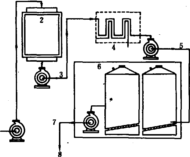 图3 柑桔果肉四级浸提示意图 1.原汁(12白利度)输往粗滤机;2.粗滤后的原汁输往蒸发器;3.果肉(12白利度)进入第一级混合机;4.果肉浸提汁(5.3白利度)进入第一级混合机;5.果肉(8.6 白利度)进入第二级混合机;6.果肉浸提汁(7.8白利度)输往浸提汁蒸发器; 7.果肉浸提汁(3.3白利度)进入第二混合器; 8.果肉(5.9白利度)进入第三级混合器; 9.果肉浸提汁(1.5白利度)进入第三级混合器; 10.果肉(3.6白利度)进入第四级混合器; 11.添水(每千克果肉添加1.25千克水); 12.排出浸提后的果肉(1~2白利度) 柑桔浓缩汁常常贮藏在不锈钢容器中。为了避免在贮藏时的异味变化, 应在浓缩汁中添加大约0.005%的果皮油。浓缩汁贮藏要经过浓缩、冷却等作业过程(图4),绝大多数浓缩汁容器为圆柱形大罐。