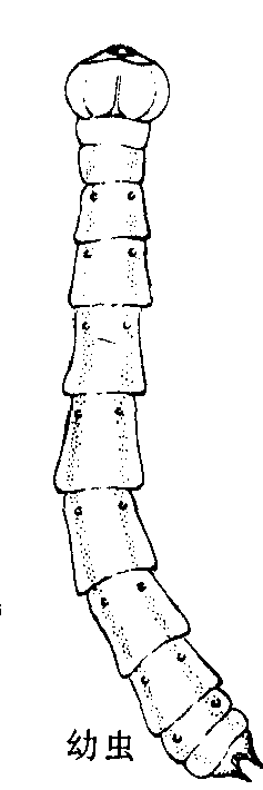 图1 柑橘爆皮虫 柑橘溜皮虫 学名Agrilus sp.。分布于中国浙江、福建、广西、广东、四川等省区。寄主植物为柑橘类。成虫体长10毫米左右,黑色,微带金属光泽,头顶两复眼间的凹陷刻纹呈两个清晰的多环同心椭圆。前胸背板上的横列皱纹较粗。鞘翅黑色,密布细小刻点,端部1/3处有清晰白斑,末端的小齿较爆皮虫更为细微、卵扁椭圓形,乳白色至黄色。末龄幼虫体长23~N6毫米,扁平,乳白色,头部小。前胸背板大,近圓形,中、后胸缩小。腹部各节呈梯形,后缘显较前缘为宽,腹末具一对钳状突(见图2)蛹纺锤形,体长9~12毫米,黄白色。在浙江,四川和福連年生1代,以幼虫在枝条木质部中越冬。翌年4月化蛹,5月成虫出洞。成虫出现期不整齐,因此产卵,孵化及幼虫蛀入木质部的时间也不一致。卵产于树枝表皮外面,常仃绿褐色保护物覆盖。幼虫孵化后,蛀入树枝皮层为害,初期被害处可见流胶,以后幼虫自枝条上部向下蛀食,在皮层与木质部之间形成虫道,枝条树皮剥裂。若围绕树枝蛀害则枝条养分不能运送而枯死。虫道末端形成螺旋状,有时在中段也出现一个螺旋状,末龄幼虫在最后一个螺旋处蛀入木质部越冬。蛀入孔新月形,羽化孔D字形。