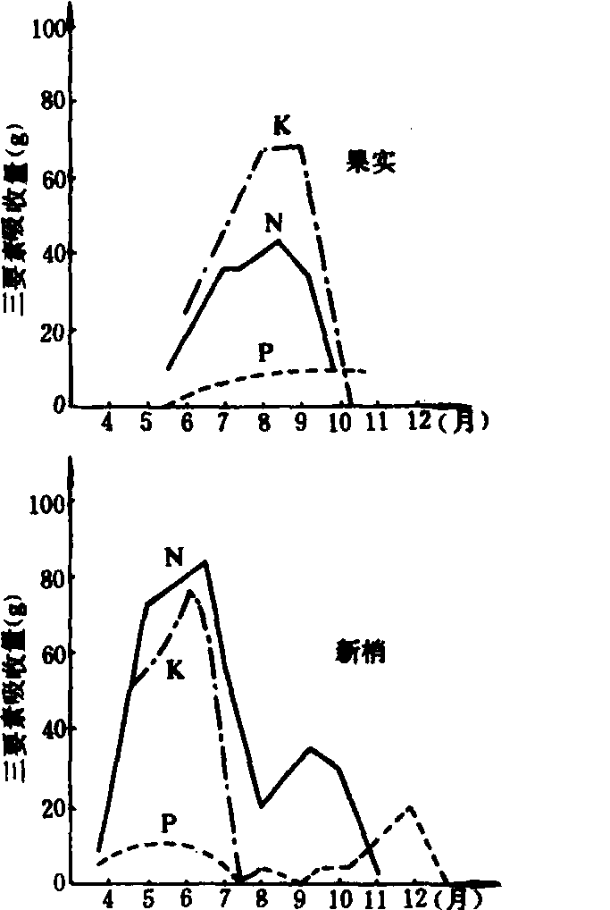 钾营养 树体中含钾量远比磷高,叶片含钾1.0%,果实为0.2%,干、枝、根为0.3%~0.4%。钾能增强光合作用,并促进光合产物的运输,因而能提高产量、改善品质。缺钾橘树,生长受到严重抑制,尤其在果实膨大期缺钾,果实发育不良,果小,产量低,贮藏后味淡,且易腐烂。但施钾过量则会抑制钙、镁的吸收,使果汁少,酸度高,糖酸比低,特别是高钾能促进氨基酸形成蛋白质,使腐胺形成减少,因而由腐胺控制的果皮增厚。 钙和镁营养 不同器官中含钙量差异悬殊。以温州蜜柑为例,果实含钙为0.1%,枝干和根为1%,叶片中高达3%以上,老叶的含钙量又比新叶高。增施钙肥能促进柑橘生长,提高产量和改善品质。 叶片和枝梢中的含镁量高于其他部分,果实成熟时,种子内含镁量增多。供镁不足,果实中可溶性固形物、柠檬酸、维生素C降低,甜橙的果肉及果皮呈灰白色,不耐贮运。通常,无核的哈姆林甜橙不易缺镁,有核菠萝甜橙易缺镁,这是因为种子需要较多的磷酸镁。 硼和铁营养 柑橘树喷施硼肥后,叶片的光合强度提高,干物质增加。但叶中含糖量普遍降低,不论是全糖、双糖、单糖都比对照低,这表明喷硼能加速糖分在树体内的运转,保证根系及果实等器官的生长发育,因而坐果率、产量均增加,而且果型端正、色泽鲜艳而光亮,果皮薄,果汁及可食部分增加。施硼降低幼果果柄离层纤维素酶活性,使离层不易形成,因而可明显减少落花落果。 铁参与叶绿素形成,对缺铁橘树喷施铁肥,能提高叶片中活性铁和叶绿素含量,每株结果数、单果重均增加,产量提高。在滨海盐渍土和石灰性土壤上种植的橘树,缺铁情况十分普遍,其典型病状是幼嫩新梢叶发黄,但叶脉仍保持绿色,严重时叶呈黄色或白色,尤以秋梢或晚秋梢更为明显。 施肥技术 施肥量 一般每公顷产37500千克的柑橘园的施肥量为:N 375~450千克,P2O5180~225千克,K2O375~450千克,N、P2O5、K2O的平均比值为1:0.5~0.6:1。为提高果实品质,施氮量可以适当减少。在不同地区,不同土壤与气候条件,以及不同品种、树龄、树势等,施肥量及三要素的比例应作适当调整。 施肥时期 根据柑橘不同生长期对养分的需要,柑橘施肥一般分为3次:❶春季发芽肥。主要是促进春梢充实,形成结果枝,并供给开花结果的养分,为当年抽梢结果和翌年健壮的结果母枝打下良好基础。发芽肥按萌芽时期的早晚而定,一般在春芽萌发前1~2星期或春梢转绿时施。施用过早,气温低,根系吸肥力弱,肥料利用率低;施用过迟,在抽梢、开花时肥效不能及时发挥。发芽肥以氮肥为主。 ❷夏秋保果、壮果肥。这次肥料又可分为夏季保果肥和秋季壮果肥。夏季柑橘幼果正处在细胞旺盛分裂时期,需要大量养分,如果营养不足,常发生大量生理落果。因此,应在第一次落果后,第二次生理落果前,即5月下旬追施一次以速效氮肥为主、配以磷肥的保果肥。秋季除果实迅速膨大外,树体还要抽出大量秋梢,作为翌年的结果母枝,因此形成一个突出的吸肥高峰。这次肥料常在柑橘停止落果后施用,以化学氮肥为主,配施一些磷、钾肥,以提高果实品质,又能使夏秋梢充实,并为花芽生理分化奠定物质基础。 ❸冬施采果肥。橘树经过开花结果,树体消耗了大量养分,为了恢复树势,促进花芽分化,充实结果母枝,保证第二年抽梢结果所需养分及提高树体抗寒能力,采果前后必须施肥。通常早熟品种应随采随施,晚熟品种应先施后采,但不宜早于采果前一星期,晚于采果后一星期。过早施用常使果实延迟成熟,过晚施用肥效不易发挥,不利于树势恢复和翌年花芽分化。采果肥以厩肥、饼肥等有机肥为主,并配施一定比例的速效性化学肥料。三次施肥对柑橘周年生长的作用见图3。