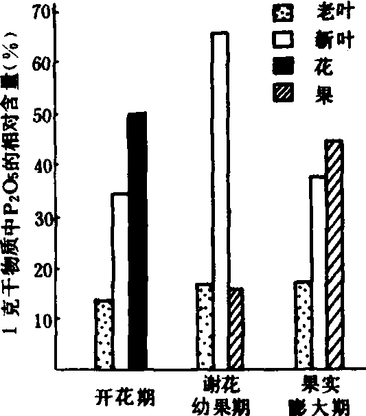 图1 温州蜜柑成年树的新梢及果实中 N、P、K吸收量的季节性变化 氮营养 树体内的氮,以叶片的分配比例最高,约占35%~40%,枝干次之,为26%~28%,根和果实中最低,大致在10%~23%。叶片中含氮量对产量和品质有深刻的影响。叶片含氮量低时,干径增长量小,产量低,果实含酸量高,含糖量低,着色也较差;含氮量过高,干径增长量也减少,果皮增厚,产量降低。同时,氮过多时,树体内形成大量赤霉素,抑制乙烯的生成,从而使花芽的形成受阻,导致产量降低。此外,温州蜜柑的浮皮果也因施氮过多而加重,这在果实发育后期尤为明显。 磷营养 树体内的磷,以花、种子及新梢、新根的生长点等器官含量高,而枝干部分含量低。在不同生育期,因其生长中心不同,器官中的含磷量也有变化。开花期以花中含磷量最高,谢花、幼果期以新抽生的嫩叶最多,果实形成并开始膨大以后,则以果实和新叶为多(图2)。满足磷的供应,可促进花芽分化,提高产量,使果汁、糖分增加,酸度降低,品质改善。