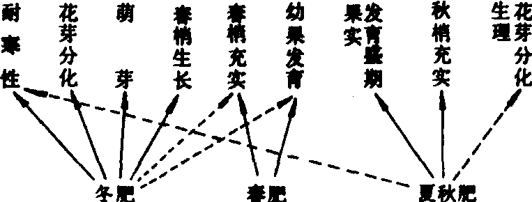 图3 各期肥料的作用示意 各期肥料的施用比例,各地有较大差异。施有机肥较多的地区可以提倡“冬重春促,夏秋补足”的原则,即各季分配比例是冬肥占50%~60%、春肥和夏秋肥各占15%~25%。以无机肥料为主的地区可以把施肥重点放在夏肥,氮、磷、钾应占60%以上。N、P2O5、K2O的比例为1:0.6:0.8。 |