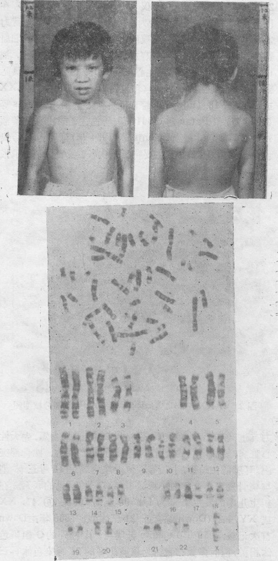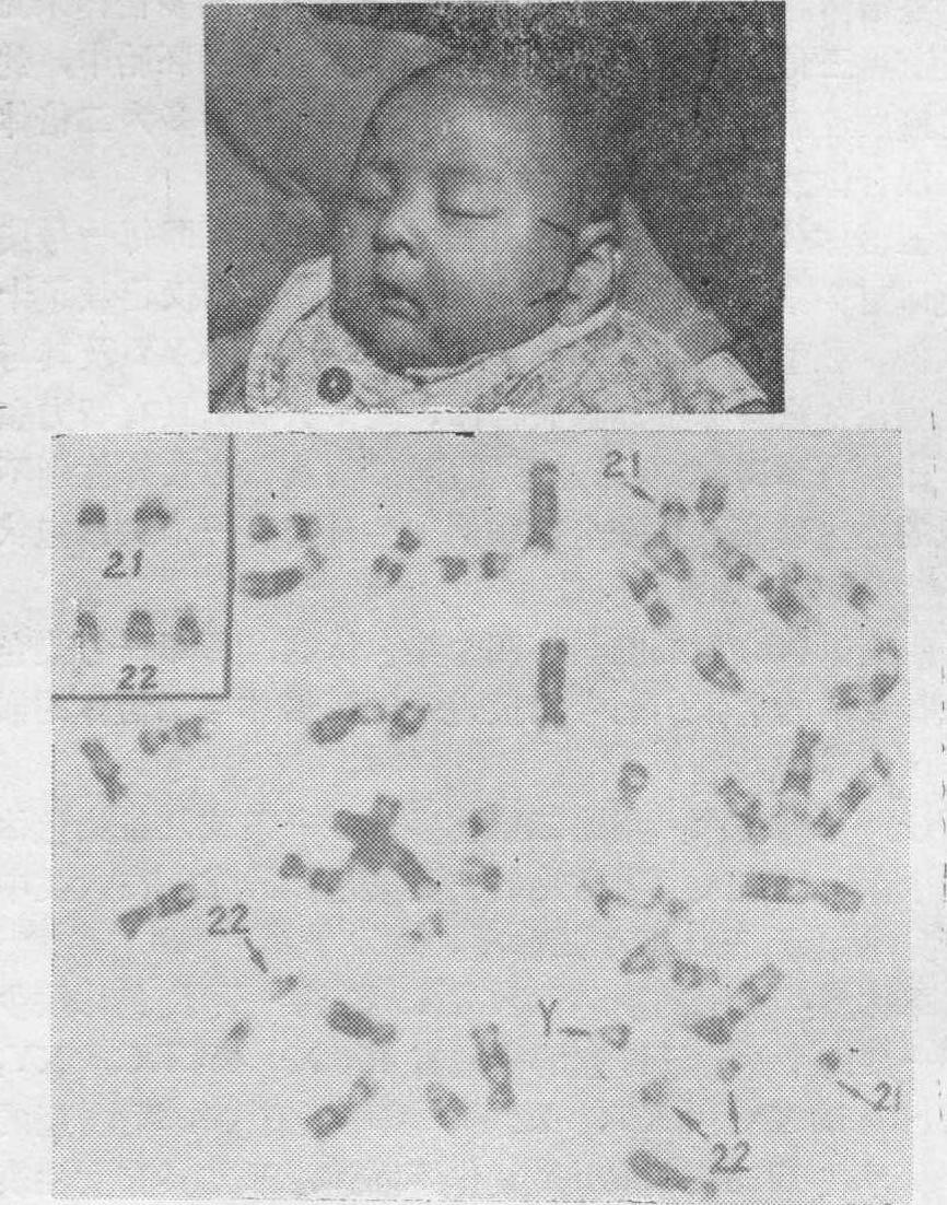 图2 47,XX,+18患者的中期染色体照片及部分核型图 力亢进,髋关节外展受限,手指尺向弯曲,胸骨短,先天性心脏病,短而弯曲的大趾,摇椅形足底,隐睾,枕骨部突出,耳廓低位畸形,小颌等。值得注意的是18号三体型与桡骨发育不全和血小板减少症有一种罕见的联系。在新生儿中的发生率约为1/3500至1/7000。❺47,XX或XY,+21(Down综合征,21三体型):1866年由Down首次记载,1959年Lejeune证明与一个额外的G组染色体相关,以后多数作者认为该类患者的21号染色体有三条;1965年Yunis等用放射自显影方法证明该类患者的G组中小的染色体(即22号)有三条,1971年巴黎会议为了既改正以前有关21三体型是G组中大号染色体有3条的错误认识,又照顾已有资料中把先天愚型当为21号染色体三体型的习惯,特将染色体丹佛(Denver)体制中的21和22号染色体的编号作了颠倒,即将其中较小的那对染色体排为21号,较大的那对染色体排为22号。该类患者在居民中的发生率约为1~2‰。主要特征是智力低下,发音迟缓,眼裂外斜,内眦赘皮,宽眼距,上腭高尖,张口吐舌,通贯手,男性伴有一侧睾丸不降(图3)。 ❻47,XX或XY,+22: 即22号染色体有三条。其特征包括智力和身体发育障碍,小头,小颌,腭裂,耳大而低位,耳前有皮赘和窦道,肌张力亢进,手指长而极其柔软等(图4)。 ❼47,XXX: 多数患者有智力低下和生长发育迟缓,宽眼距,内眦赘皮,上腭高尖,原发型闭经,第二性征发育差等特征。 ❽47,XXY(Klinefelter综合征,或先天性