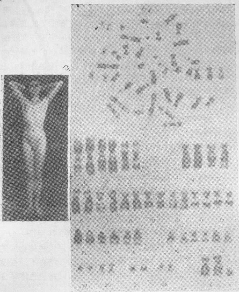 图4 22三体型患者外观及核型图 睾丸发育不全症):1942年由Klinefelter首次记载,1959年由Jacobs等确定核型为47,XXY。其发生率占一般男性的1‰,占男性精神发育不全病人的1%,占男性不育症的1/10。主要特征是曲精细管发育不全,睾丸小,