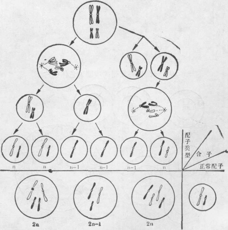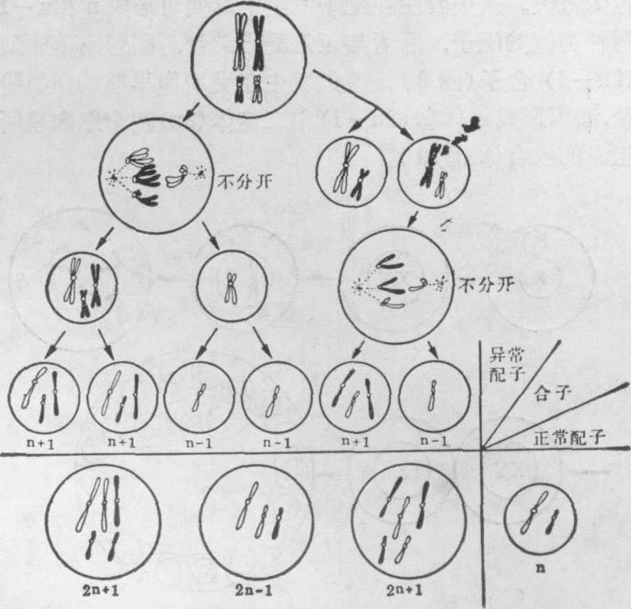 图6 示起源于配子形成中的染色体不分开而产生的三体型 (2n+1)和单体型(2n-1)的合子