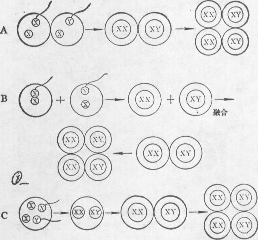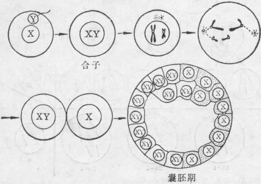 图7 示受精卵早期卵裂中染色体不分开所形成的嵌合体(XO/XYY)