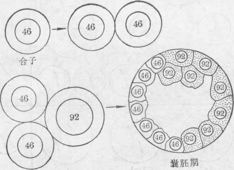 图9 示受精卵早期卵裂中染色体遗失所形成的嵌合体(XY/XO) (3) 核内复制:在细胞有丝分裂中,染色体及其着丝粒虽已完成了正常的复制,但由于某种干扰,纺锤体形成受到破坏,该细胞内的46对姊妹染色单体不能分开,细胞也不能进行分裂,因而在间期时形成一个含四倍染色体(4n)的细胞核。当这个细胞进入下次有丝分裂时,其每