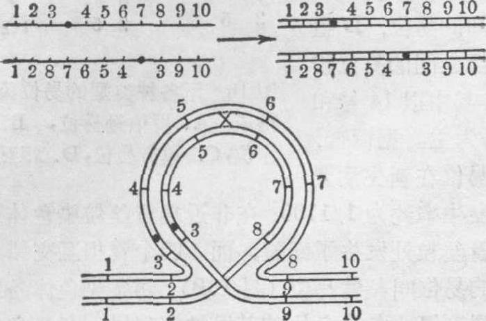 图13 示在倒位节段携带者的第一次成熟分裂中期,可见的倒位圈示意图 之间的交换,理论上可形成4种不同的配子,其中有2种配子各带有一条重组染色体。它们分别与正常的配子相结合,则可形成4种类型的合子。其中仅一种为正常者;一种为表型正常的倒位携带者;其他两种为部分重复和部分缺失的重组型(表1)。表1 示由臂间倒位节段携带者所产生的配子与正常配子结合所形成的合子类型