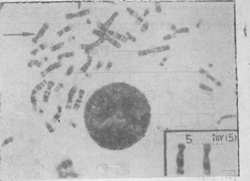 图11 示受精卵早期卵裂中染色体核内复制所形成的嵌合体(2n/4n) 一染色体都回复到正常的复制和分开状况,因此,在中期细胞内便可见到每4条姊妹染色单体整齐排列的现象。叫核内复制(图10)。核内复制发生在精原细胞或卵原细胞的有丝分裂中,则可形成含92条染色体(4n)的精原或卵原细胞,经过减数分裂则可形成含46条染色体(2n)的配子,这种异常的配子与正常的配子结合,则可形成含69条染色体的三倍体。核内复制发生在受精卵第一次卵裂中,则可形成四倍体。核内复制发生在受精卵的早期卵裂中,则可形成具四倍体(4n)和二倍体(2n)两个细胞系的嵌合体(图11)。染色体结构畸变 七十年代以前,用常规技术仅记载了4p-综合征(WoIf-Hischhorn syndrome),5p-综合征(Cri-du-chat Syndrome,或猫叫综合征),″5q-综合征,13q-综合征,18q-综合征,21q-综合征等少数类型。七十年代以来,由于应用了鉴别力高的染色体显带技术,至今在新生儿和成人中已记载的染色体结构畸变近300余种,几乎涉及到每一号染色体的长、短臂,甚至每一个区或带,除携带者(带有染色体结构异常,但染色体物质的总量仍为二倍体的、表型正常的个体)外,均有不同程度的智力和发育障碍,目前记载较多的新的常染色体综合征有50余种。 (1) 缺失(del): 当某一染色体发生断裂而未能重接时,则将形成一个具有着丝粒和一个或多个无着丝粒的节段。无着丝粒节段由于在细胞分裂中不能定向移动,一般被遗失在细胞质中;被保留下来的具有着丝粒节段,由于丢失了部分遗传物质,故称为缺失。任何一条染色体的长臂或短臂的末端节段缺失,称为末端缺失(terdel)。任何一条染色体的长臂或短臂的某一中间节段遗失称为中间缺失(inter del)。在人类中,至今已记载的末端缺失有40余种; 中间缺失有10余种。在常染色体方面,较常见的有5p-综合征,这个综合征于1963年由Lejeune等描述,由于出生后哭声象猫叫而命名为猫叫综合征。现已记载近200例,约70%为女性患者。其发病率约为1/50000。绝大多数病例是由于一个早复制的B组染色体的短臂缺失35~55%所致。其主要特征是智力、生长和运动障碍,小头,圆脸,反常的机敏面容,内眦赘皮。眼裂下斜,眼距宽,缩颌,50%的患者有心血管异常。在性染色体方面,较常见的有46,X,del(X)(q21:)(图12)。 (2) 倒位(inv):某一染色体同时发生两次断裂,其中