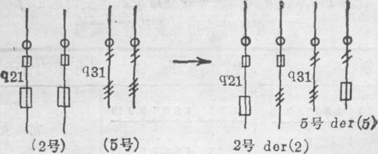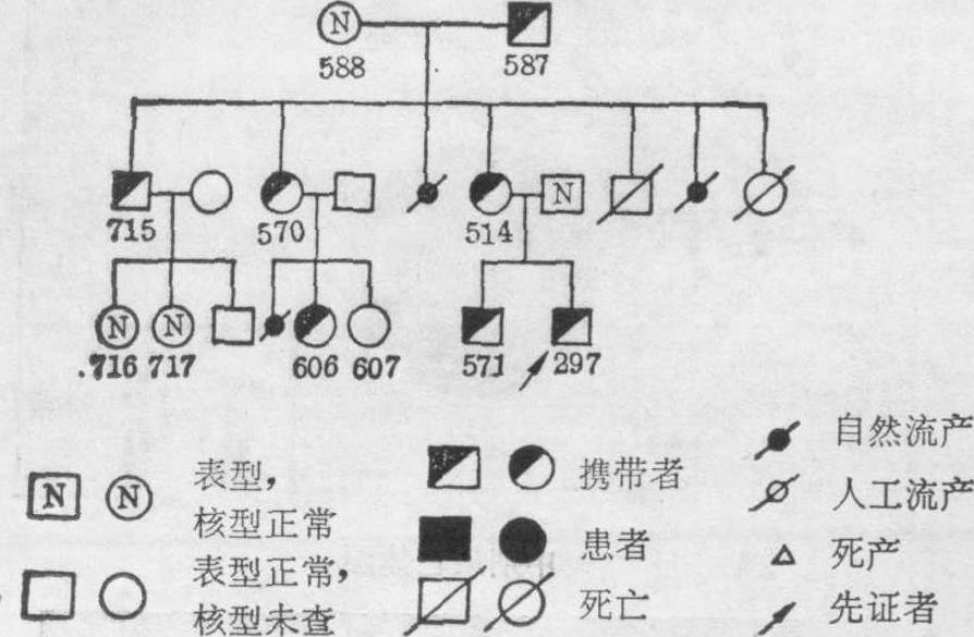 图14B 一个46,XX或XY,inv(5)(p15.1 q33.1)的家系图 (3) 重复(dup):在同一条染色体上某一节段连续含两份或两份以上者,称为重复。其重复的节段与原方向一致,即近侧端仍靠近着丝粒者称为顺向重复(dir.dup.);反之,其重复节段的近侧端远离着丝粒者称为反向重复(inv,dup.)。此外,重复尚有其他的含义,象多倍体,多体型,部分三体型全是重复的不同形式,至今已记载的人类染色体部分三体型有80余种,其中较常见的有20余种。46,XY,-13,+der(13)t(4; 13)(13pter:→ 13q34: 4q25→4qter) pat,即4q部