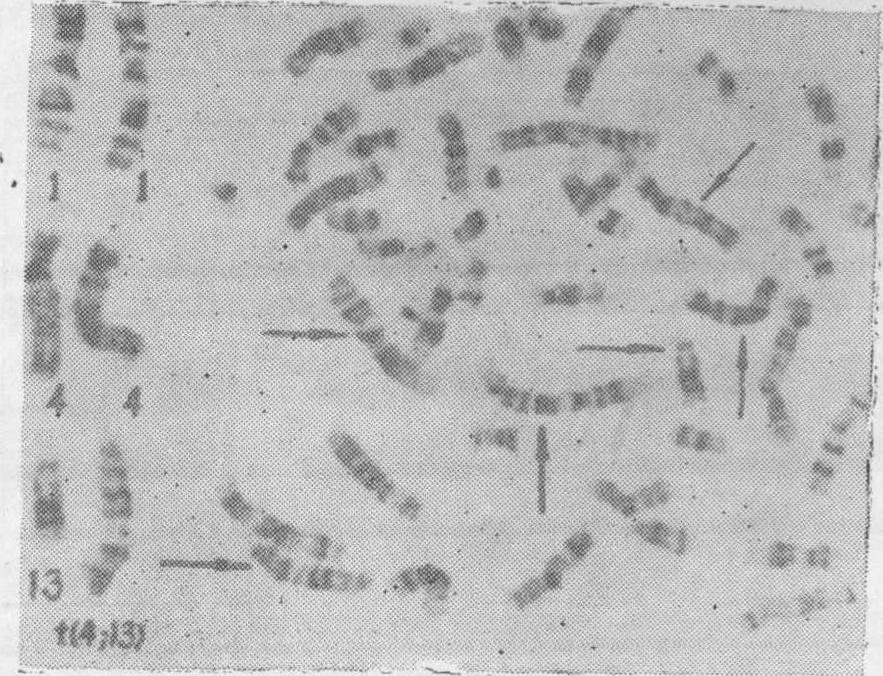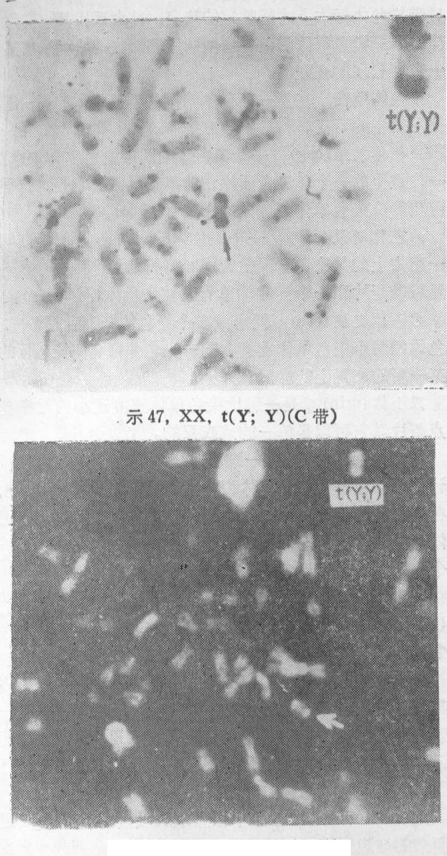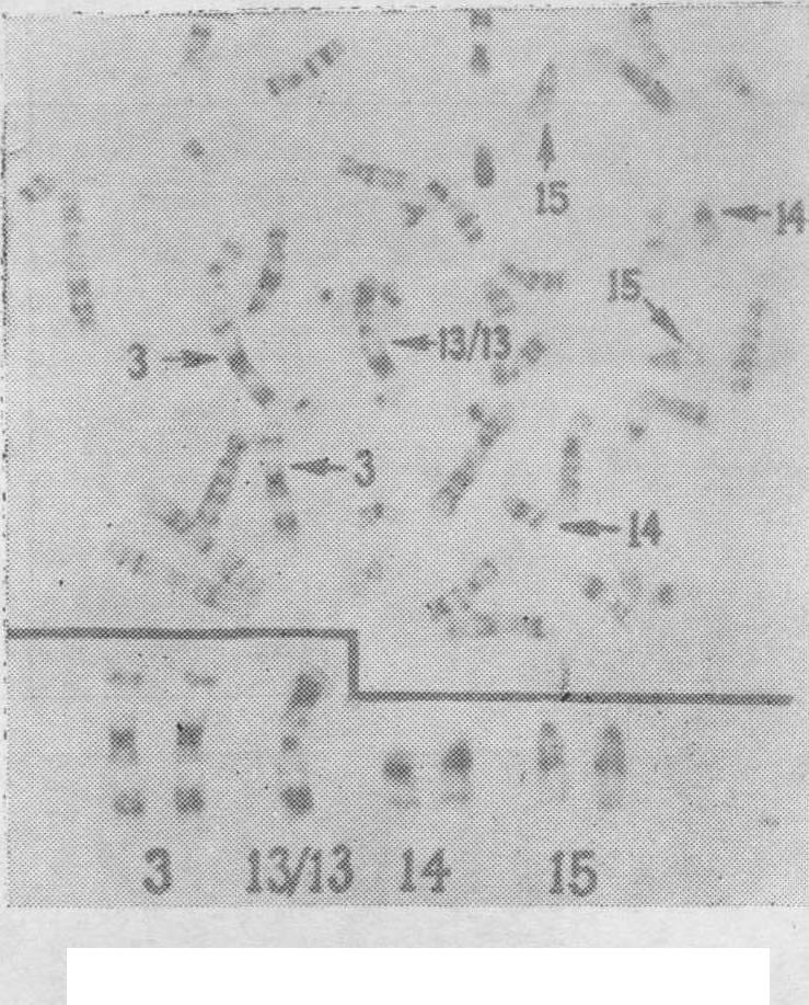 图18 46,XY/45,XY,t(13; 13)(p12; p12)的罗伯逊易位型嵌合体的染色体图 流产8次,均于妊娠2个月内流产,因此离婚,女方与他人再婚、生育正常。本人再婚后,第二个妻也在2个月内自然流产3次,临床上找不到任何原因。夫妻表型正常,外周血淋巴细胞和皮肤细胞培养及G显带染色体分析,其妻核型正常,本人核型为46,XY/45,XY,t(13;13)(图18),是一个同源的13号染色体之间的罗伯逊易位型的嵌合体。在淋巴细胞中异常核型占64%,在皮肤细胞中异常核型占45%。46,XY或XX,t (15; 17) (15pter→15q22.3::17p13.1→17pter; 17qter→17p13.1::15q22.3→