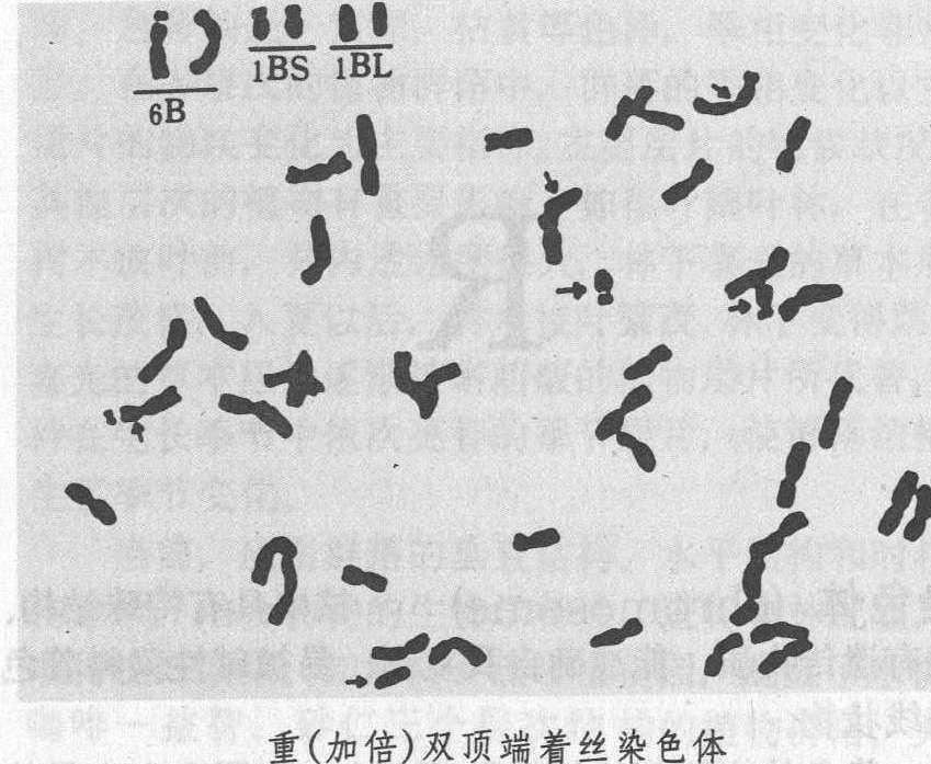 染色体非整倍性chromosome aneuploidy个别染色体增减并非染色体组数增减的现象。正常二倍体个体称双体或二体(2n)。增加1条染色体为2n+1,称三体; 减少一条为2n-1,称单体; 2n-2为缺体;2n+2为四体;2n+1+1为双三体等等。 类别 单体 2n体细胞的某同源染色体只有一个而不是两个的现象,即2n-1。大多数动植物的单体不能存活,只有多倍体的小麦和烟草分别有成套的21种和24种不同的单体,是细胞遗传学研究、进行基因定位的基础材料。单体减数分裂可以形成n和n-1配子。根据正常双体小麦与单体的正反交测定,得知n和n-1的雌雄配子的传递率不同,n-1卵细胞的传递率为61~86%,平均为75%,n卵细胞的传递率为25%,而n-1雄配子的传递率为1~19%,平均为4%,n雄配子为96%。据此,单体自交后代的染色体数目分别为双体(2n)的24%,单体(2n-1)73 %,缺体(2n-2)3%。由此可知,必需逐代进行细胞学鉴定,才能保存单体植株。双单体是2n细胞中两对同源染色体各减少一条染色体,即2n-1-1。 三体 2n体细胞的某同源染色体为三个的现象,即2n+1。最初在蔓陀罗中发现三体,其12种三体(n=12)就有12种蒴果形状表型。三体有三种:❶初级三体为2n+1,减数分裂前期I配对时形成(n-1)Ⅱ+Ⅲ(Ⅱ表示二价体,Ⅲ表示三价体); ❷次级三体,增加的一条染色体为等臂染色体,每一个初级三体有相应的两个次级三体的可能; ❸三级三体,增加的一条染色体由两条不同源的染色体片段组成。此外,双三体是2n细胞中两对同源染色体各增加一条染色体。 四体 2n体细胞的一对同源染色体增加2条染色体的现象,即2n+2,可通过三体自交产生。四体减数分裂后期I四条染色体的分离有2:2、3:1、4:0,甚至还有0:0等可能的形式。从理论上讲四体可以大量形成2n+1配子,但实际上从2n与(2n+2)的杂交后代中2n+1的个体只有40~50%。四体自交可以得到2n+1、2n个体,但2n+2的个体却很少。 缺体 二体生物的体细胞缺失了某一对同源染色体的现象,即2n-2。由于缺掉一对染色体,个体的生存和生长都受到很大影响,缺体最早在燕麦中发现,普通小麦等少数物种有人工保存的成套缺体。缺体的不良影响比单体大,许多性状和双体有明显的变化,而单体与双体在外表上则差异不大。 单顶端着丝点单体 这种个体不仅缺失一条完整的染色体,另一条染色体也缺掉一臂,只留下带有顶端着丝点的染色体,即2n-1 1/2。在减数分裂时可形成n-1和n-1/2的配子。 双顶端着丝点染色体 这种个体中的一条染色体着丝点断裂,形成两条各带着丝点的染色体。 重(加倍)双顶端着丝点染色体 这种个体的两条同源染色体着丝点断裂,形成两对端着丝点的染色体,即20″+t″ +t″(见图)在普通小麦中这种重双顶端着丝点染色体已成套。在减数分裂时配对和分离都正常。 等臂染色单体 单体的单价染色体是由顶端着丝点染色体形成的等臂染色体,在减数分裂时,形成20″和一个等臂染色体,等臂染色体在后期Ⅰ可能进入细胞一极或被排除。 双等臂染色体 染色体总数为2n,但其中有一对为同源的等臂染色体,所以实际上既是缺失,又是重复,这种个体染色体配对和分离正常。