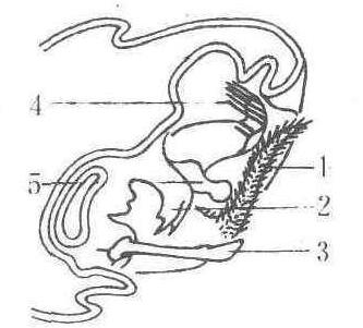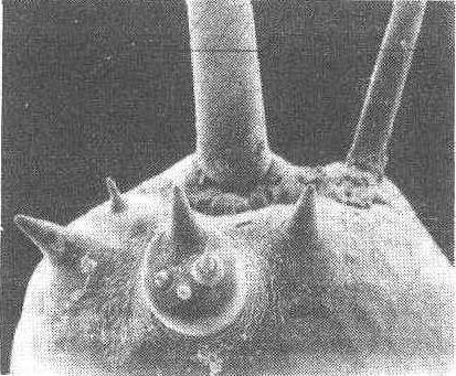 形,褐色骨质硬壳,表面有对称的刚毛和黑斑,2龄始头部表面有多数圆锥形突起,头部正面中央有倒Y 字形线缝 (中冠缝及头盖缝组成),外侧有2条浅线为蜕裂线(图1)。头部两侧下缘上颚基部着生一对触角。触角由3节构成,第2节外侧方有两根长短不一的感觉毛,第2、3节端部分别着生3个、4个圆锥形感觉突起,都具感觉作用(图2)。头部两侧下缘,触角稍上方有6对 单眼,呈黑褐色半球形隆起,表面光滑,是感光器官。口器在唇基下方,由上颚、下颚、上唇、下唇4部分组成(图3)。上唇基部和唇基相连为骨质薄片,食叶时有调整叶片位置的作用。上唇正中央有缺刻,