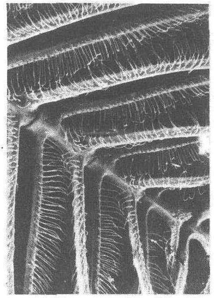 柞蚕成虫 柞蚕雌蛾大于雄蛾,除节间膜外,全身被有黄褐色鳞片,头部很小,被鳞片,胸部3节高度骨化,中、后胸有发达的翅,腹部在外观上雌蛾可见7个环节,雄蛾可见8个环节。触角在头部两侧,复眼上方,雌蛾呈双栉齿状,雄蛾呈羽状。主干由30几个小节构成,每一小节向两侧横向派生一对侧枝,侧枝表面着生多数感觉毛(图8)。主干侧枝表面还着生多数圆锥形突起。复眼在触角下方,呈黑色半球形构造,表面有排列整齐的六角形小眼似蜂窝状(图9)。口器已退化,下颚及下唇须较明显,下颚为白色囊状,表面有多数微皱、小孔及少量刚毛,下唇须由3节构成,表面被有鳞片。鳞片的形状可分叶状、毛状、纺锤状三种,其分布因部位而略见差异。扩大观察鳞片表面有纵走的脊椎状隆起,中间有细绒毛状物。胸足由5节构成,即基节、转节、腿节、胫节、跗节。跗节由5小节构成,其先端有2个黑色骨化钩爪,之间有爪间体,钩爪基部两侧外方着生褥盘,前足胫节端部有发达的距,其表面有许多针状突起。气门在第1胸节及1~7腹节两侧,呈半月形,筛板不很发达,筛板的侧枝上微见小突。雄蛾外生殖器由9、10腹节形成,包括抱器、钩器、阳茎(图10)。抱器位于阳茎外侧方一对大形附属器,包括表面有刚毛的上枝为第1抱器,下枝为第2抱器及内表面分出的一个骨化突起为第3抱器。钩器位于左右抱器之间,阳茎腹面有骨化的钩状突,阳茎突出于第9腹节腹面中央的骨化的棒状,端部有射精孔。雌性外生殖器由8、9、10腹节形成,包括侧唇、锯齿板等。侧唇由9、10腹节愈合,呈白色半球形囊状体。表面有多数感觉毛,正中央裂缝有2个孔口,上端是肛门,下端是产卵孔。锯齿板由第8腹节腹板形成,高度骨化。其腹前方为交配孔开口(图11)。