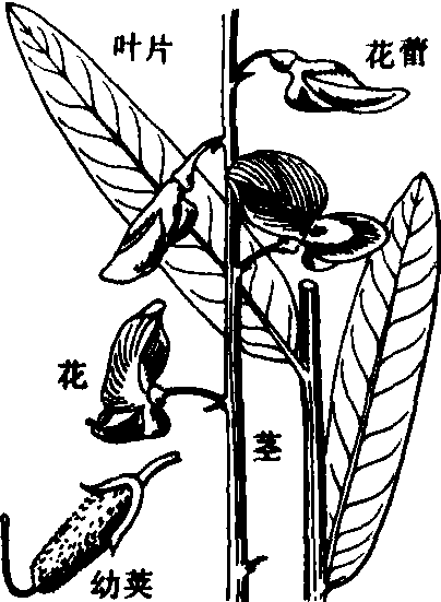 柽麻 1. 叶片 2. 茎 3. 花蕾 4. 花 5.幼荚 柽麻豆科野百合属一年生草本植物。株高可达3.3 m。根系分布于15 cm的土层内。单叶互生,总状花序顶生,着花12~20朵。荚果长2~4 cm,每荚含种子6~15粒。最适生长温度25~30℃。播种约50天便可利用。鲜草含水分约80%,氮0.32%~0.65%,磷酸约0.15%,氧化钾约0.3%。 |