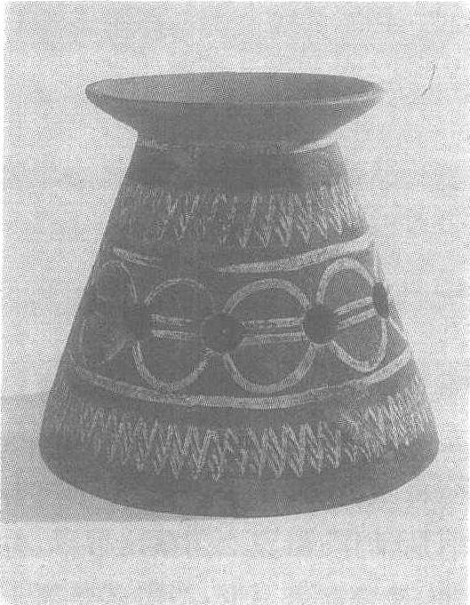| 释义 | 栅栏半月纹镂孔彩陶器座 栅栏半月纹镂孔彩陶器座新石器时代青莲岗文化。高24.1厘米,口径19厘米。1976年江苏省邳县大墩子遗址出土。江苏省南京博物院藏。此器上小下大,有一盘口,质地为泥质红陶,造型规整,器身以红、白两彩绘多层纹饰。上下两层栅栏纹夹以相对的两层半月纹,并有一圈镂空圆孔。此器纹饰繁复,色彩醒目浓重,具有典型的青莲岗文化艺术风格。青莲岗文化见“八角星纹彩陶盆”条目。