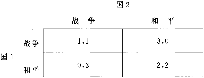 则标准型对策的第一个要素是I={国1,国2},N=2;第二个要素是S1={战争,和平},