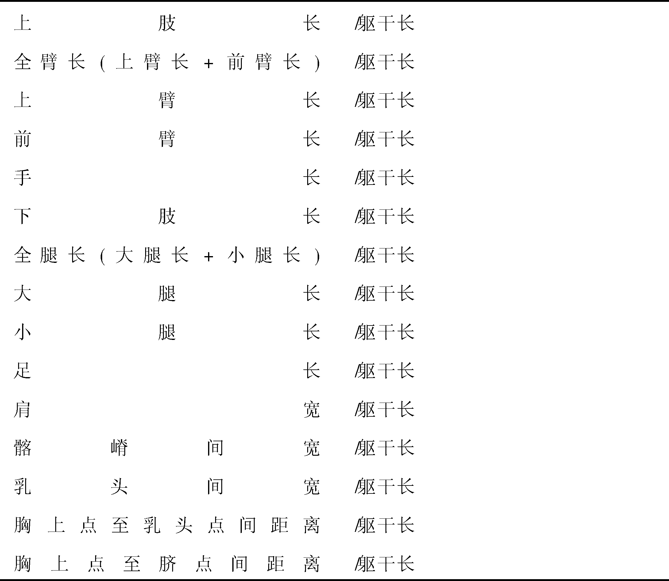 在体部测量中,可采用两种以上的测量值组成各种不同的指数,以表示身体各部分的比例和形状特征。 ❶标准指数 a=×100 ❷标准指数 b=×100 为了比较起见,身体各部任何一项测量值均可分别与身高值或躯干长值组成比例,故上述两指数被称为标准指数。