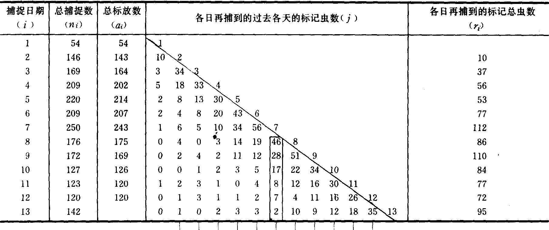 Ri= 80 70 71 109 101 108 99 70 58 44 35 表2 j日或j日以前标记的动物在i日被再捕总数计算表 (据Jolly,1965)