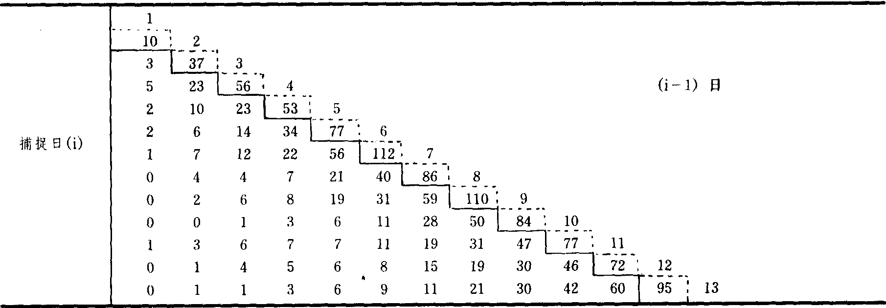 表2是由表1引出,表示在第i日捕到第j日(或j日以前)标记的再捕数(γ1),即表1中各行由左至右相加所得,如γ7=1+6+5+10+34+56=112,在表2中各列粗线上端的数即γi。在i日以后捕到的标记数(Z1),见表2中除第一数以外的各列累加数,如Z7=40+31+11+11+8 +9 =110 乔利法的种群总数估值公式为: