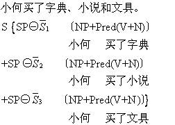 (SP=Structure Particle (结构助词); S指比S低一个层次的小句(clause)) 该句由UPM(2)+UP(2)+UPM+ ❷组成,但还不是表层,只有经过增、删、分、合、移等转换规则才能转换成表层结构。如上例中的第二和第三处UPM中的NP和V由于跟第一个UPM中的NP+V同指一个对象,因此必须强制性地删除,这样才能转换为表层结构: 小何买了字典、小说和文具。 ☚ 句法形式标志 词类标志 ☛ |