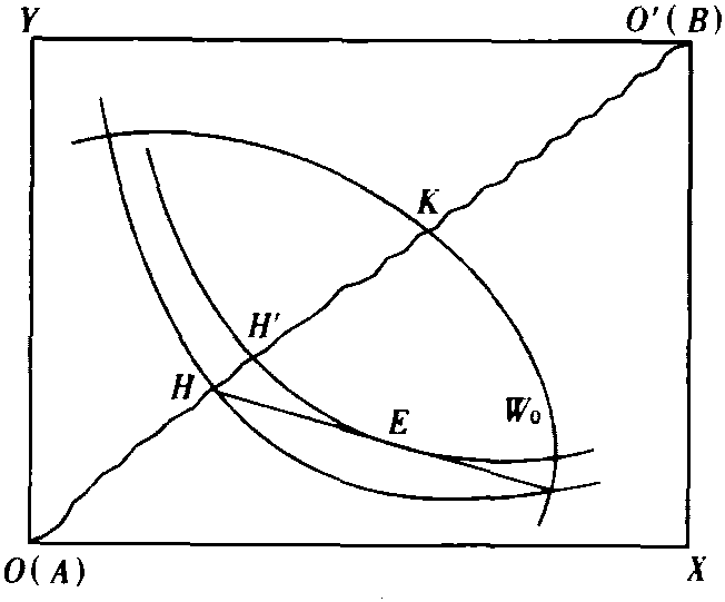 图2 在2人的纯交换经济中,核就是如图1的梭形内契约曲线HK部分,如果将这一简单经济“复制”一遍,得到一个4人纯交换经济,可以证明,核将缩小。如图2所示,这时左下角的2人(称为A 1和A 2)可以与右上角的1人(称为B 1)联合起来,使B 1达到H点,即(x HB,y HB)点,也就是说,B 1用△Y=y 0B-y HB与A 1和A 2交换得到△x=x HB-x 0B,其中(x 0B,y 0B)是B 1在W 0点的配置。如果A 1和A 2地位平等,他们均将用1/2△x=1/2(x HB-x 0B)交换得到1/2△Y=1/2(y 0B-y HB)。这时,A 1和A 2的配置是[x 0A-1/2(x HB-x 0B),y 0A-1/2(y 0B-y HB)],即x EA=1/2(x 0A+x HA)和y EA=1/2(y 0A+y HA)。这是因为x HA+x HB=x 0A+x 0B和y HA+y HB)=y_((0A+y 0B。说明交换后,A 1和A 2的配置在H和W 0连线的中点E(x EA,y EA)上,过E的A 1和A 2无差异曲线与契约曲线相交于H′点,这样HH′将是A 1和A 2可以联合抵制的配置。同理B 1和B 2也可以联合使契约曲线从K点进一步被压缩。这种“复制”过程可以无限进行下去。一般地,一个N个A和N-1个B所组成的联盟,总可以通过内部交换使得N-1个B的配置由图3中的S点(相当于图2中的H)所代表,而N个A的配置由图3中的T点(相当于图2中的E点)所代表。其中T点在直线SW 0上与S点的距离为SW 0长度的1/N。因此,只要契约曲线上某点S和W 0的连线有一部分在通过S点的无差异曲线I的右上方,那么总可以找到适当大的N,使得上述同盟的交换结果T点在SW 0连线的位于曲线I右上方的那一部分上。于是相当于图2中的HH′这一段契约曲线便不可能在2N人复制经济的核之中。当N越来越大时,SW 0连线在无差异曲线I的右上方的部分SV将越来越短,核也越来越小。可以证明,当复制经济无限大时,核缩小为一点。这就是竞争均衡点,也是瓦尔拉均衡点。连接竞争均衡点及初始配置的直线之斜率所表示的相对价格就是竞争均衡价格或一般均衡价格。