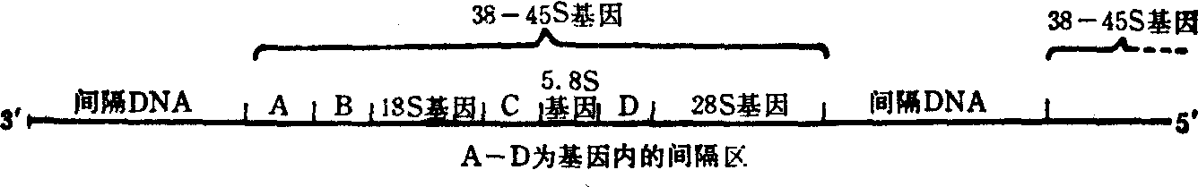 A-E是基因内的间隔DNA。X处有时有一个tRNA基因 在正常情况下,当RNA的合成进行到X段与D段的交界处时,就有RNA酶Ⅲ分子来把已合成好的部分切断,造成17 5SprRNA,而继续合成出来的后一段则是25SprRNA。只是在缺乏这种酶,或者是这种酶的活力不足时,才有P30prRNA被制出。 18S基因显然是与16S基因同源的。28S基因与23S基因也显然是同源的。现在已知原核生物其实也是有5.8SrRNA的,只是它是位于23SrRNA分子的5′端部分,并没有独立成为一个单独的分子而已。因此真核生物的5.8S基因也是来自于23S基因。虽则高等真核生物的核仁组织者并不含5S基因,但是现已发现,在酵母菌和粘菌的核仁组织者中,确实有5S基因接在它们的45S基因之后,数量与后者相等,但不是直接相联着。据此可以设想进化的历程如下: