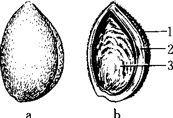 苦扁桃的核果 a.果实外形 b.去掉一半果肉的果实 1. 外果皮 2.中果皮 3.内果皮 核果 核果heguo肉果中的一类,一般内果皮木质化形成核。果皮明显分为3层,一般外果皮薄,中果皮肉质,是人们食用的部分,内果皮由石细胞组成,常呈木质化,特别坚硬,如桃、杏、李、枣、橄榄等。