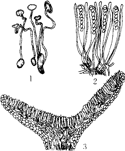 核盘菌属 1.菌核萌发形成子囊盘 2. 子囊盘 3. 子囊及侧丝 |