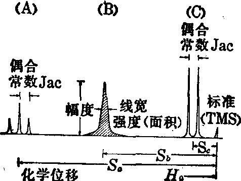 ω=rH0 这就是NMR的基本方程。满足此条件时,处于低能级的自旋核将吸收能量跃迁到高能级。对于同一种核,欲满足共振条件可采取两种方法:固定射频场频率,改变外加恒定磁场;或者固定外加磁场,改变射频场频率。由于改变射频场频率比较困难,所以一般都采用前一种方法。当恒定磁场由小到大改变时,吸收程度也随之改变,磁场满足共振条件时(H0),吸收最大。吸收程度与恒定磁场H的关系称为NMR谱。NMR谱的参量 有以下几个: (1) 化学位移:在一种化合物中,处于不同基因中的某原子核 (例如乙醇中的CH3·CH2与OH中的H核)可以有几条谱线。这是因为作用在不同基团中的H核的磁场并不严格地正好等于外加恒定磁场,它还受到分子内电子的反磁性屏蔽之故。这种反磁屏蔽的大小依赖于每个核所处的化学环境。即 H=H0(1-σ) 式中H是作用在核上的有效磁场,σ是一个无量纲常数,是特定环境下核的屏蔽常数。由于核的化学环境不同所引起的共振位置的偏离称为NMR谱线的化学位移。为便于对不同场强、频率(即不同类型的NMR仪)所获得的数据进行比较,化学位移采用相对值表示,即以ppm为单位,其定义为: