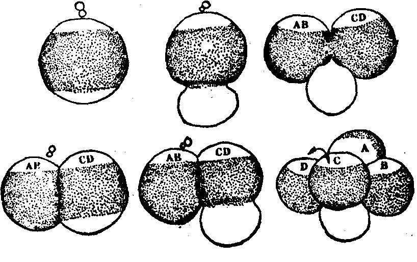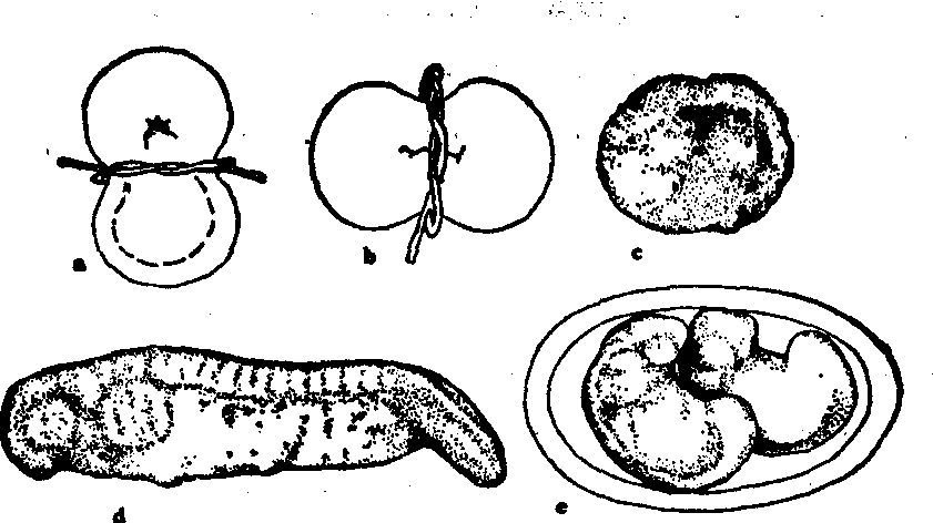 图2 角贝的卵裂 有些两栖类的卵子,在动植物极之间有一个灰色新月区。未来胚胎的对称面通过灰色新月区中央,卵质的分布是左右对称的。用纤细的童发,在两细胞时期沿着分裂面结扎,使两个裂球分开,每个裂球可以发育为一个胚胎,这是可以理解的,因为它们所含的物质相同。如果在卵裂之前沿正中面结扎,使细胞核位于一侧,另外一侧没有核,而且在这两者之间留有一条狭窄的细胞质桥相连。在有核的一侧,卵裂正常进行,没有核的一侧不分裂。以后,随着卵裂的进展,核逐渐减小,在16细胞分裂为32细胞时一个细胞核通过细胞质桥进入无核的一侧,在核进入以后,开始卵裂,勒紧发丝,将两半分离。原来无核的一半,在细胞核进入之后,开始卵裂,以后两半分别发育。原来无核的一半,所含的细胞核虽然只是受精核的1/32,但仍然能形成一个完整的胚胎(图3,b和e)。这实验说明核的等能性,只要卵质齐全就能正常发育。